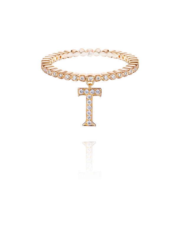 Rose gold ring with a pendant in the shape of the letter T with diamonds