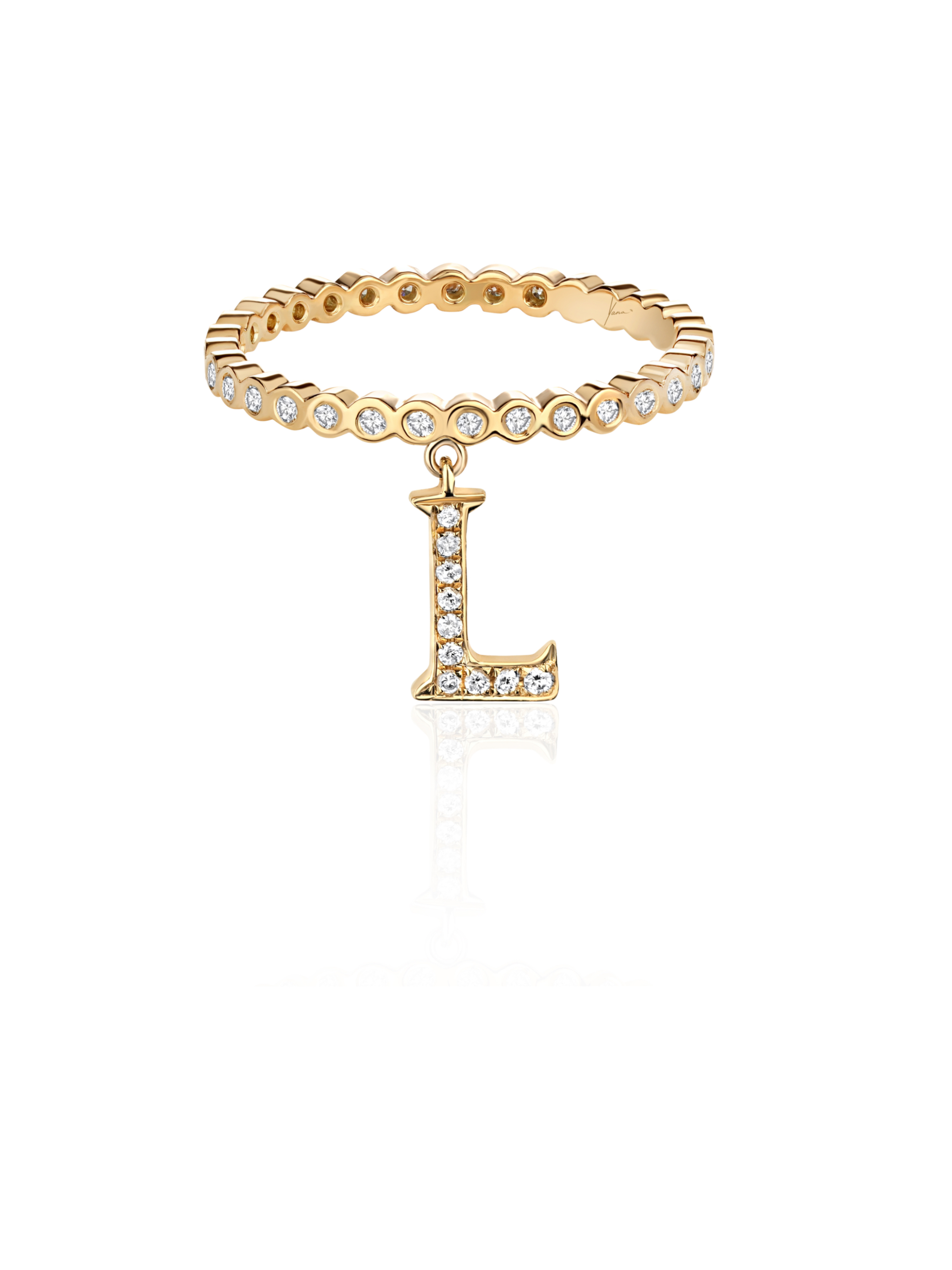 Yellow gold ring with a pendant in the shape of the letter L, set with 41 round-cut diamonds with a total weight of 0.16 ct.