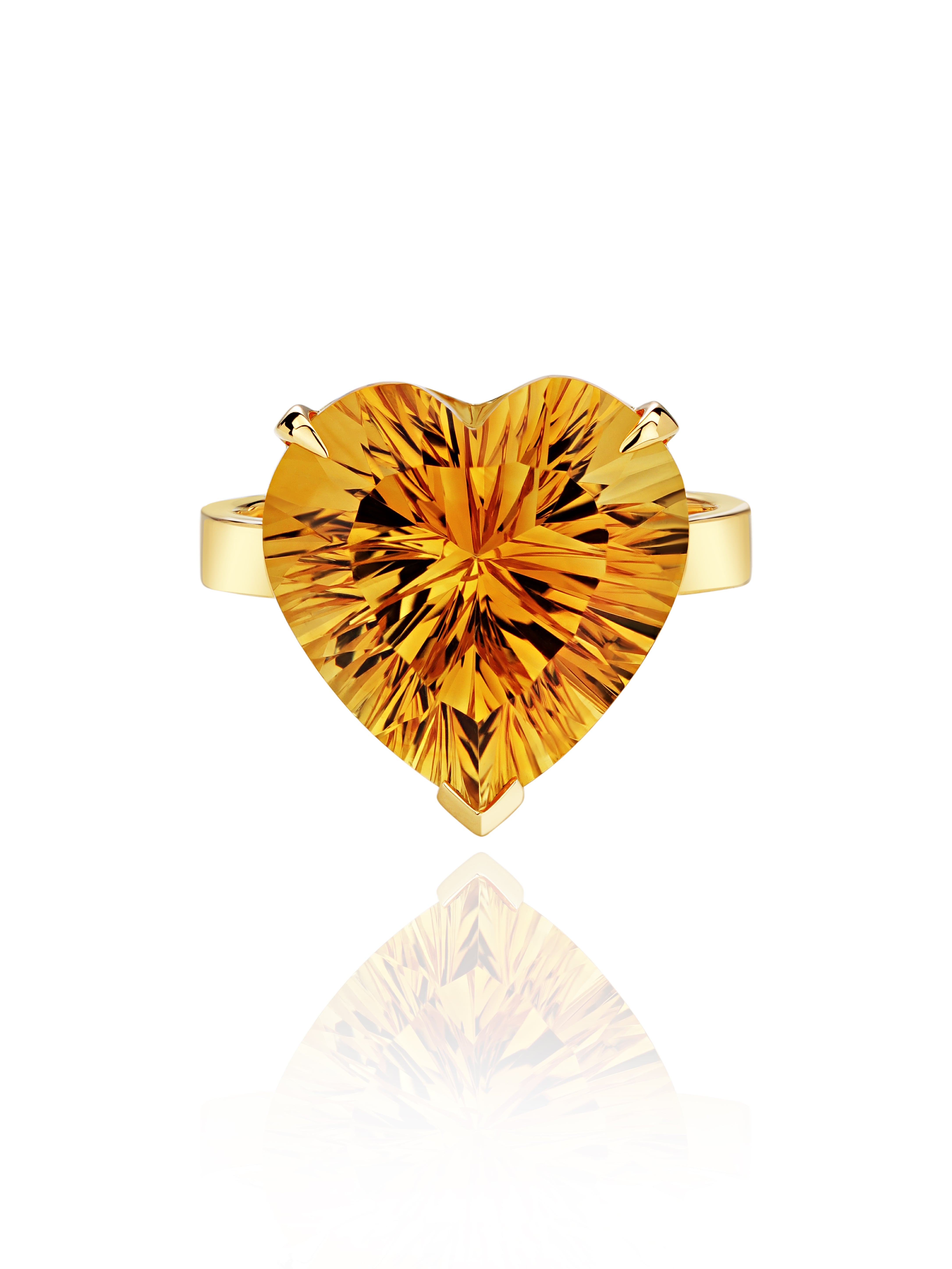 Yellow gold ring with a heart-cut citrine weighing 9.8 ct and a round-cut ruby 0.01 ct.