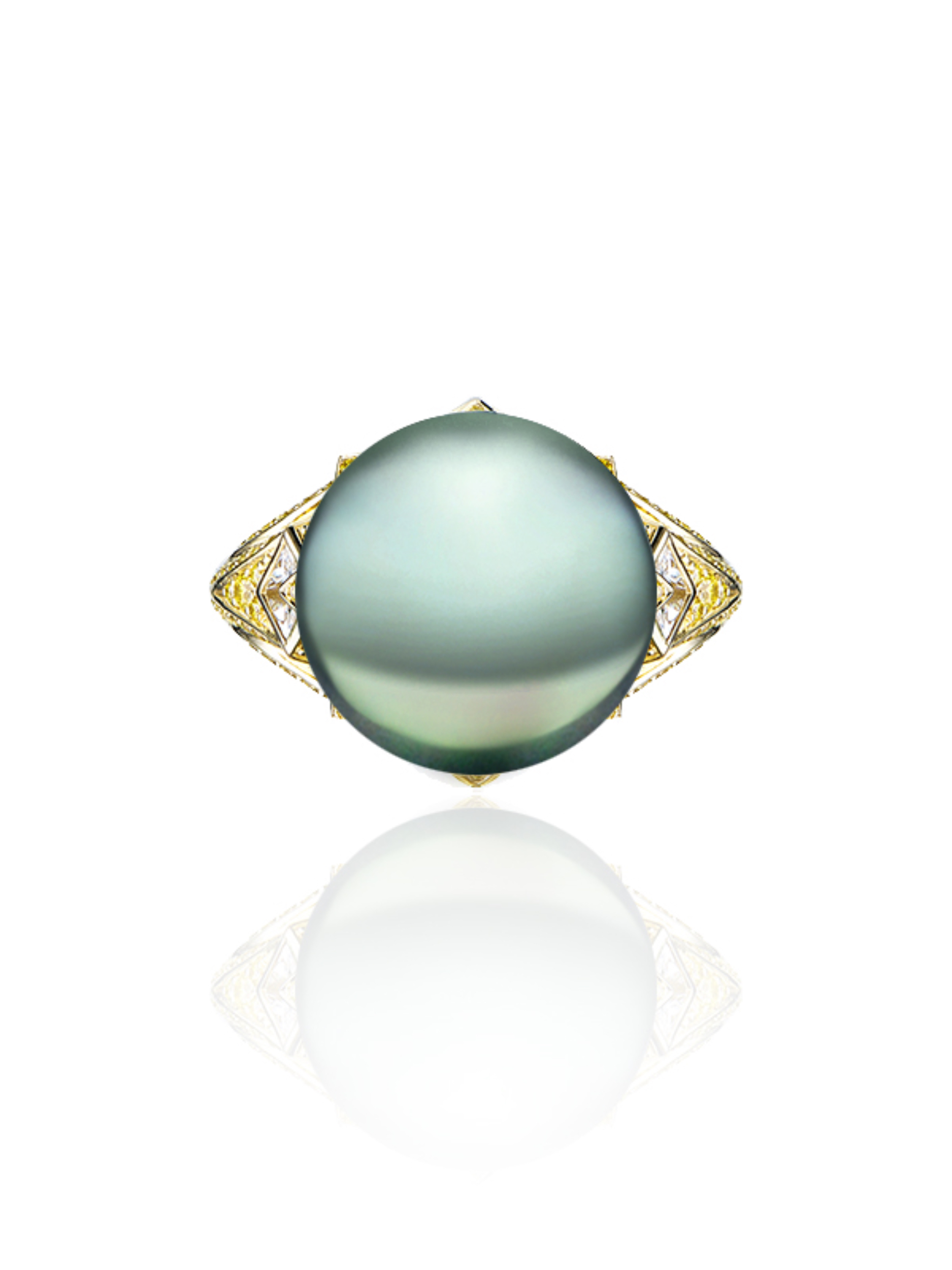 Ring made of yellow gold, inlaid with 1 black pearl weighing 5.02 g and 15.2 mm in diameter, 248 round yellow diamonds with a total weight of 1.76 ct, and 5 princess-cut diamonds weighing 0.73 ct.