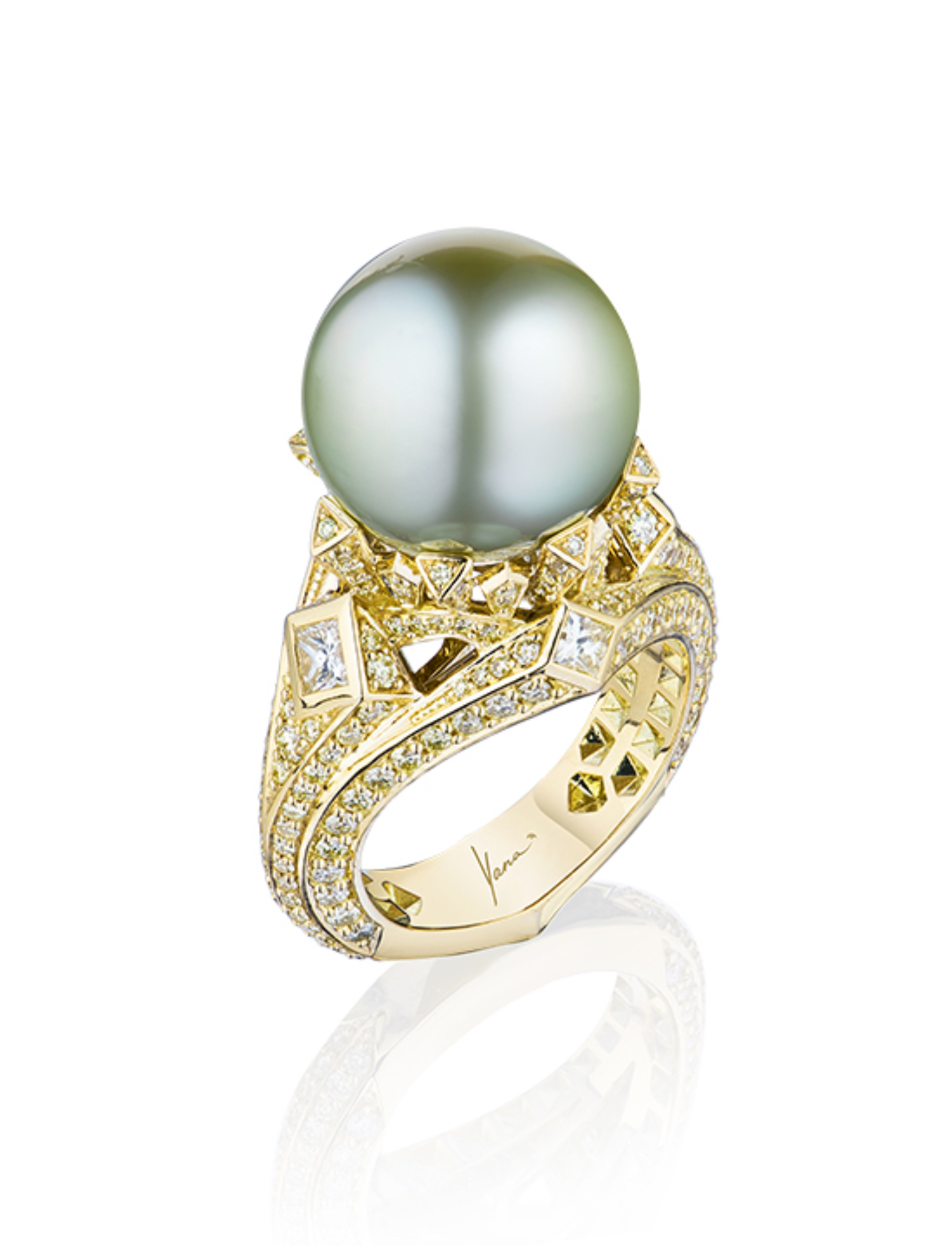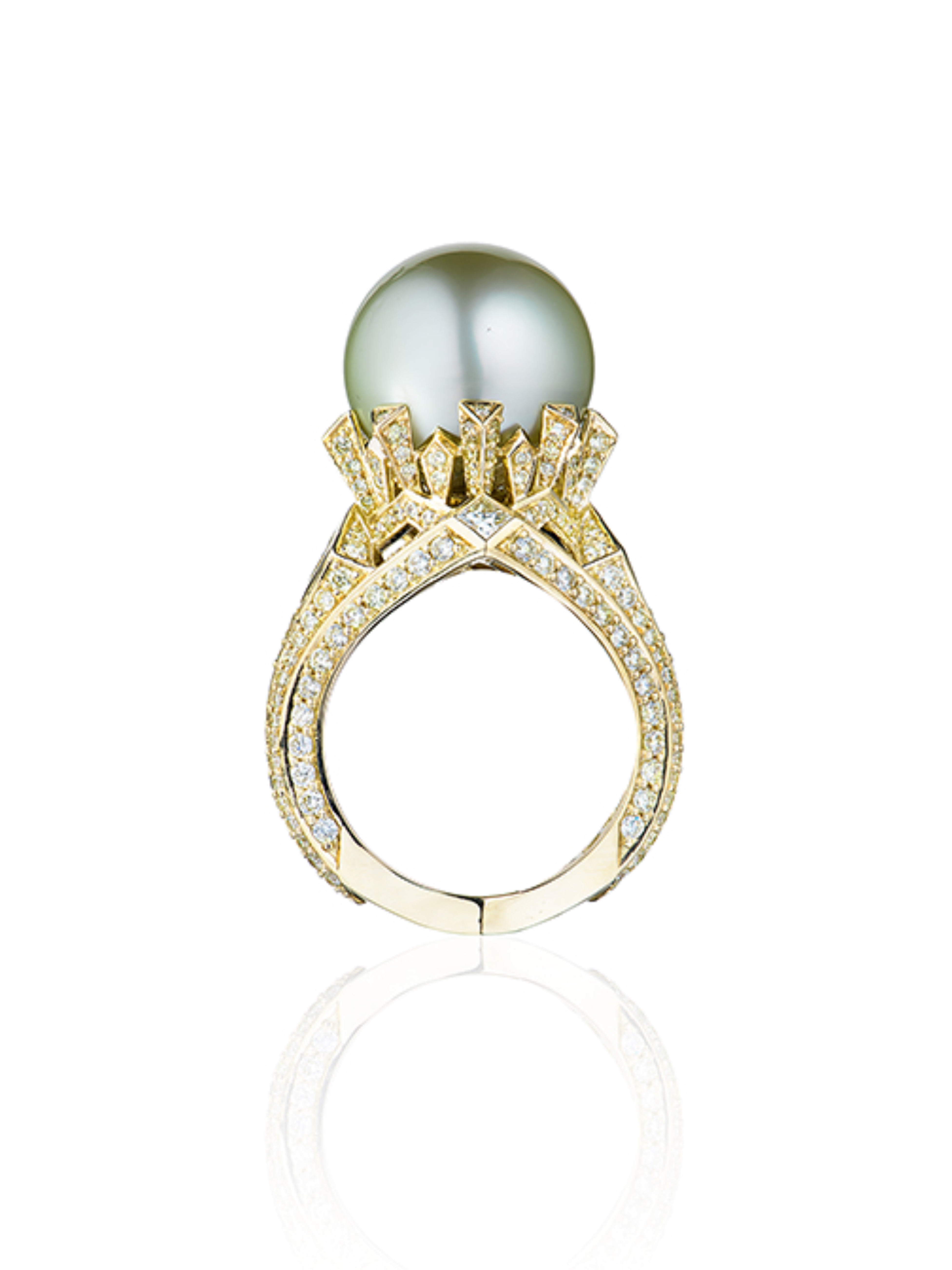 Yellow gold ring inlaid with 1 large Tahitian pearl weighing 18.27 ct (13.92*13.66), 248 round diamonds with a total weight of 1.72 ct and 5 princess-cut diamonds of 0.62 ct.