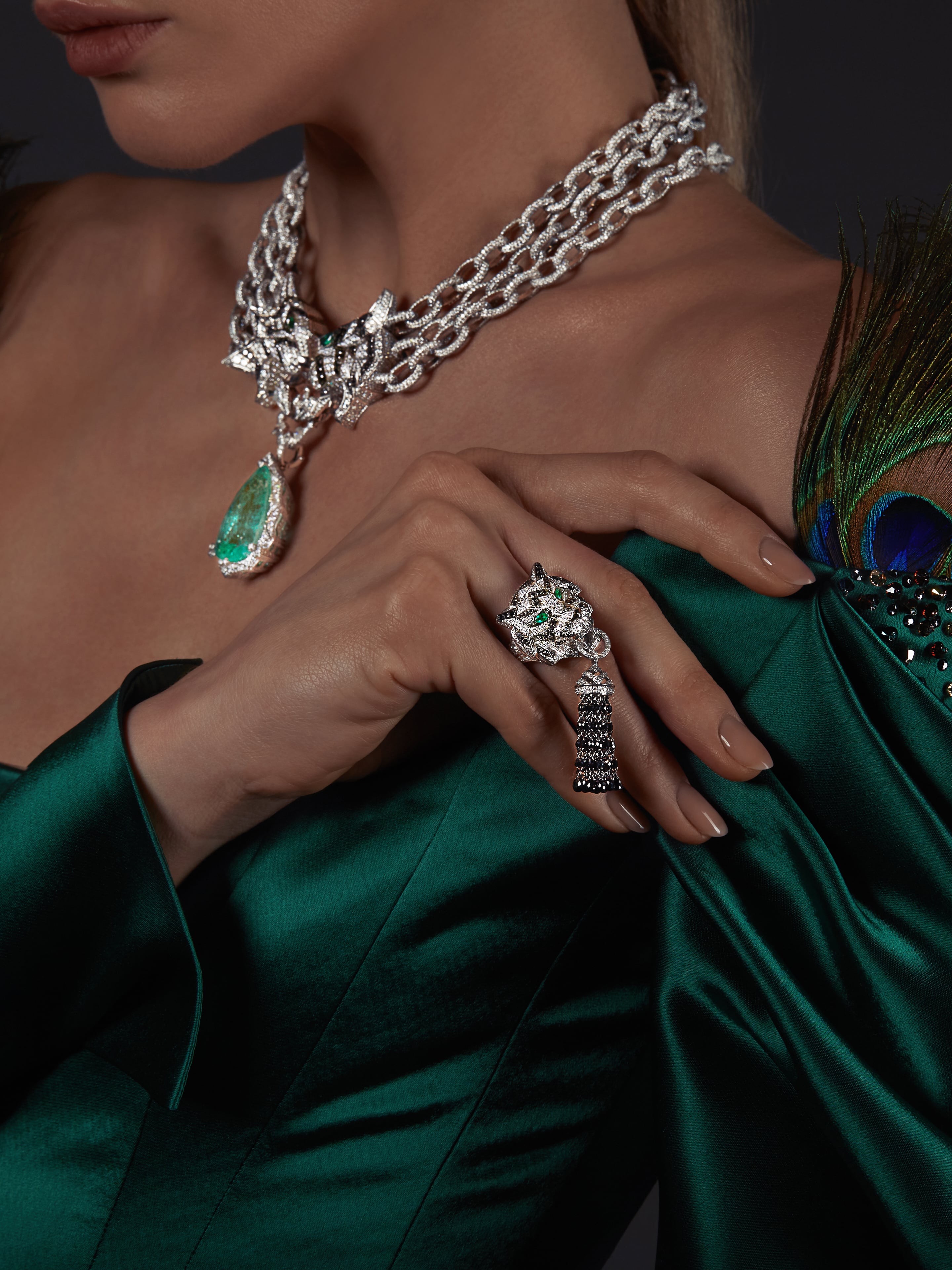 Hand ring in white gold, set with 536 round diamonds with a total weight of 2.60 ct, 76 round black diamonds with a total weight of 0.41 ct, 2 marquise‑cut emeralds, and 95 black briolettes with a total weight of 7.64 ct.