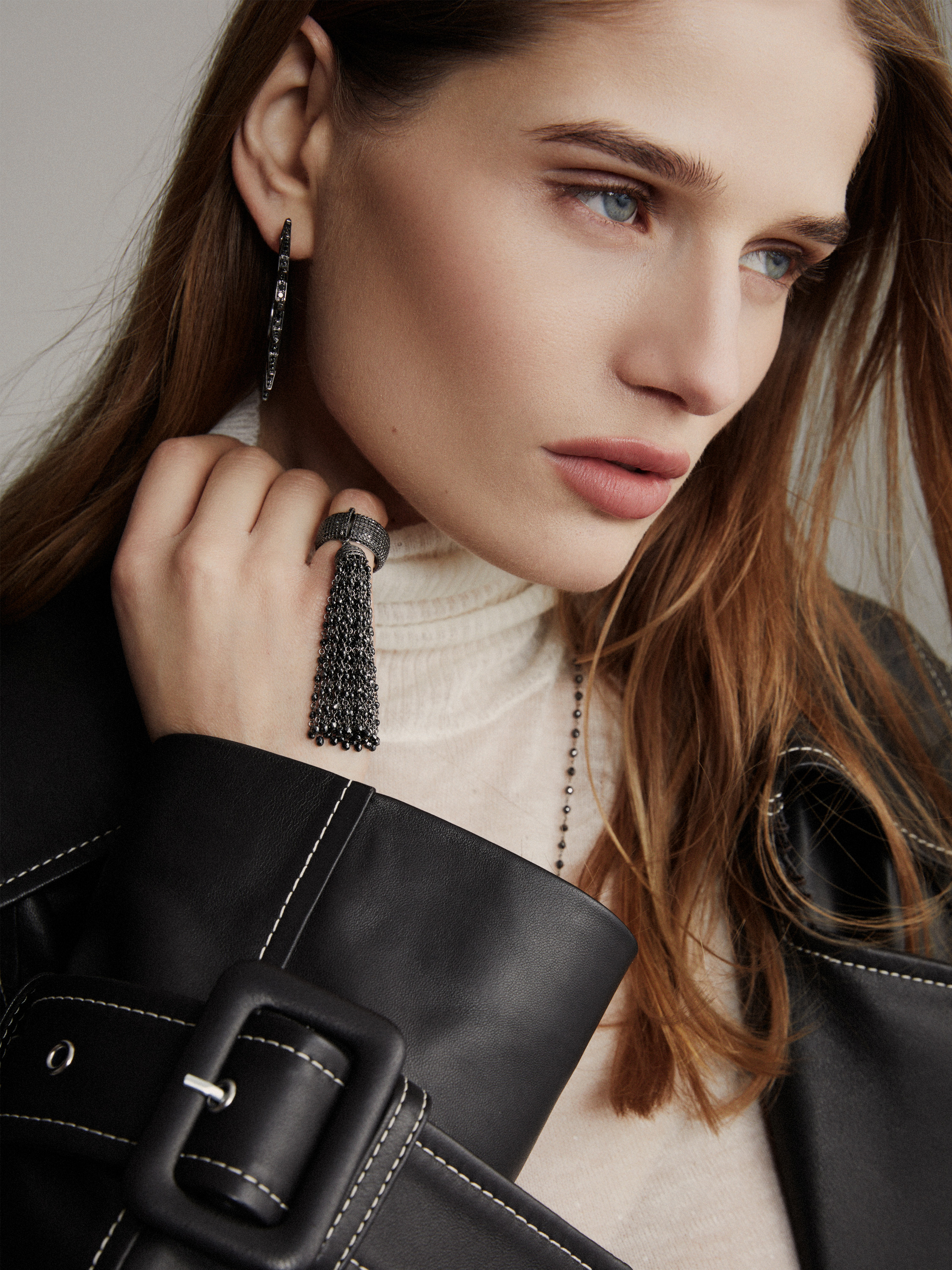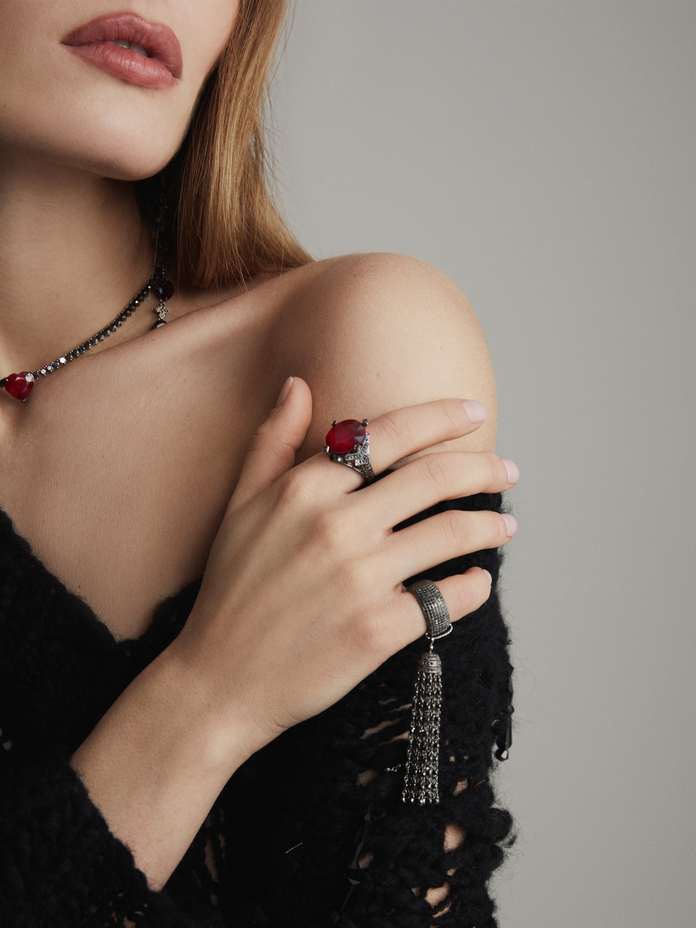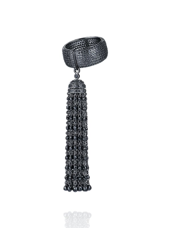 Tassel ring in blackened gold with 250 black briolette-cut diamonds with a total weight of 15.29 ct and 531 round-cut black diamonds with a total weight of 2.67 ct.
