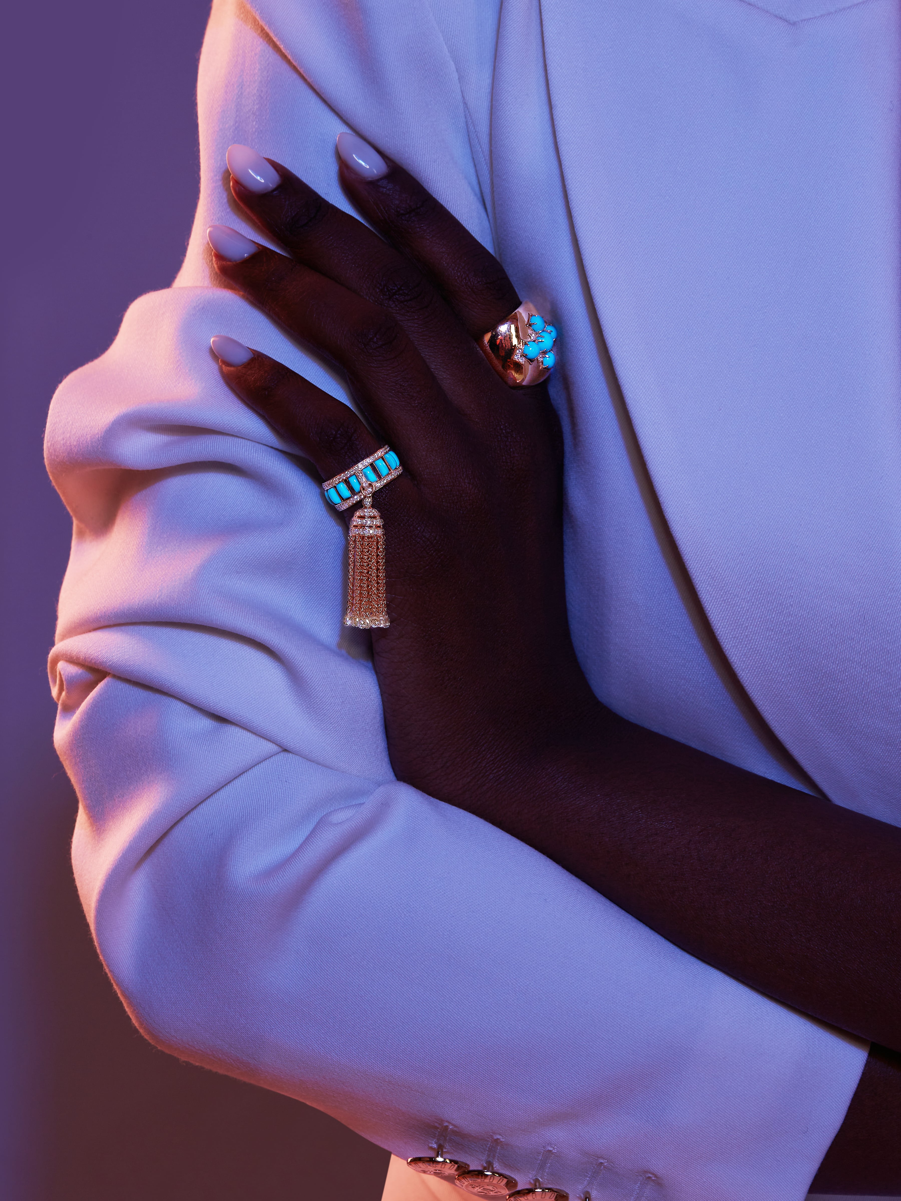 Hand ring in 18K yellow gold, set with 170 round yellow diamonds with a total weight of 1.06 ct, 14 baguette‑cut Arizona turquoise stones with a total weight of 1.75 ct, and 25 yellow briolettes with a total weight of 2.29 ct.