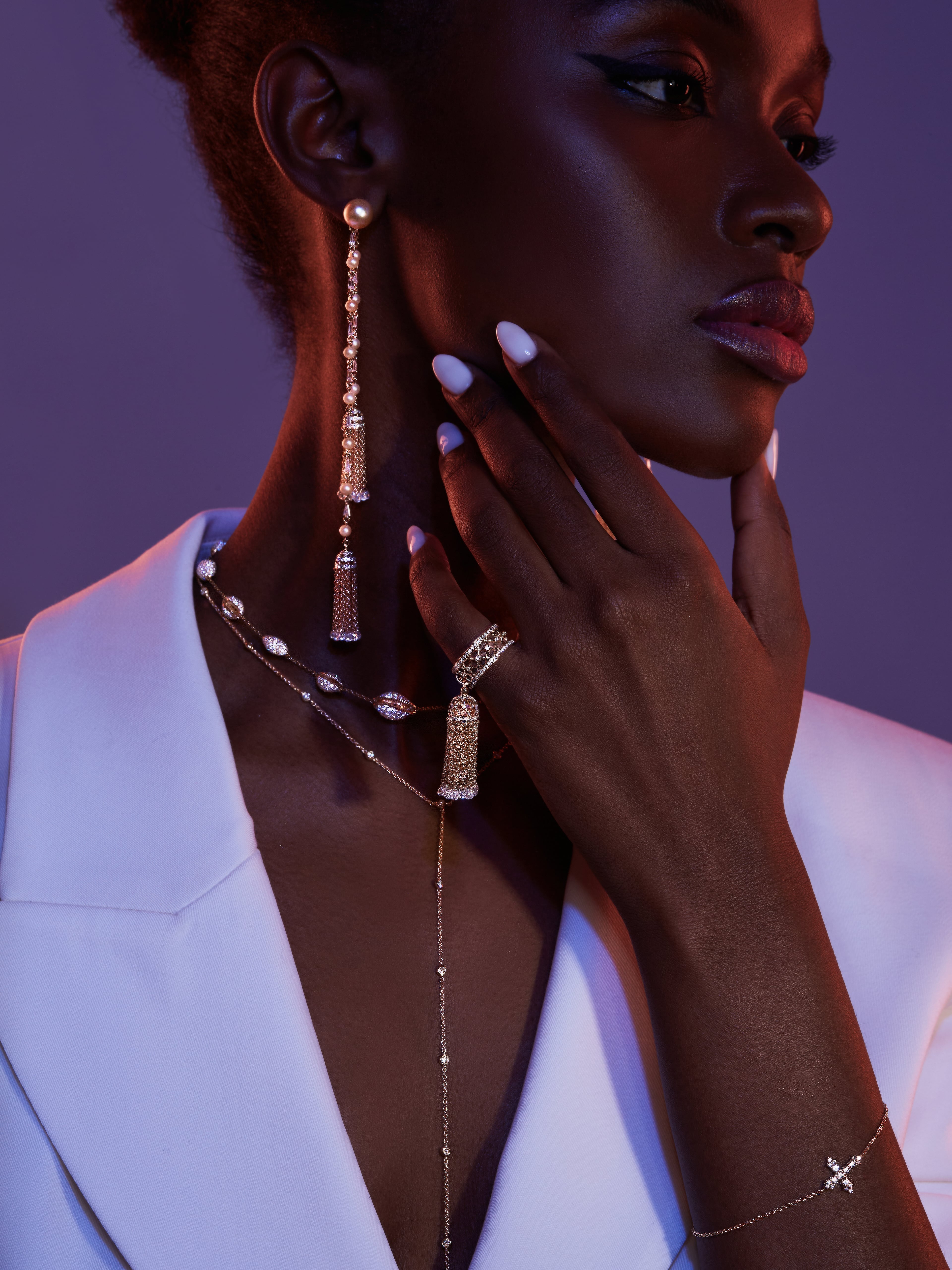 Hand ring in 750 yellow gold set with 25 briolettes with a total weight of 2.28 ct and 165 round diamonds of 0.57 ct.