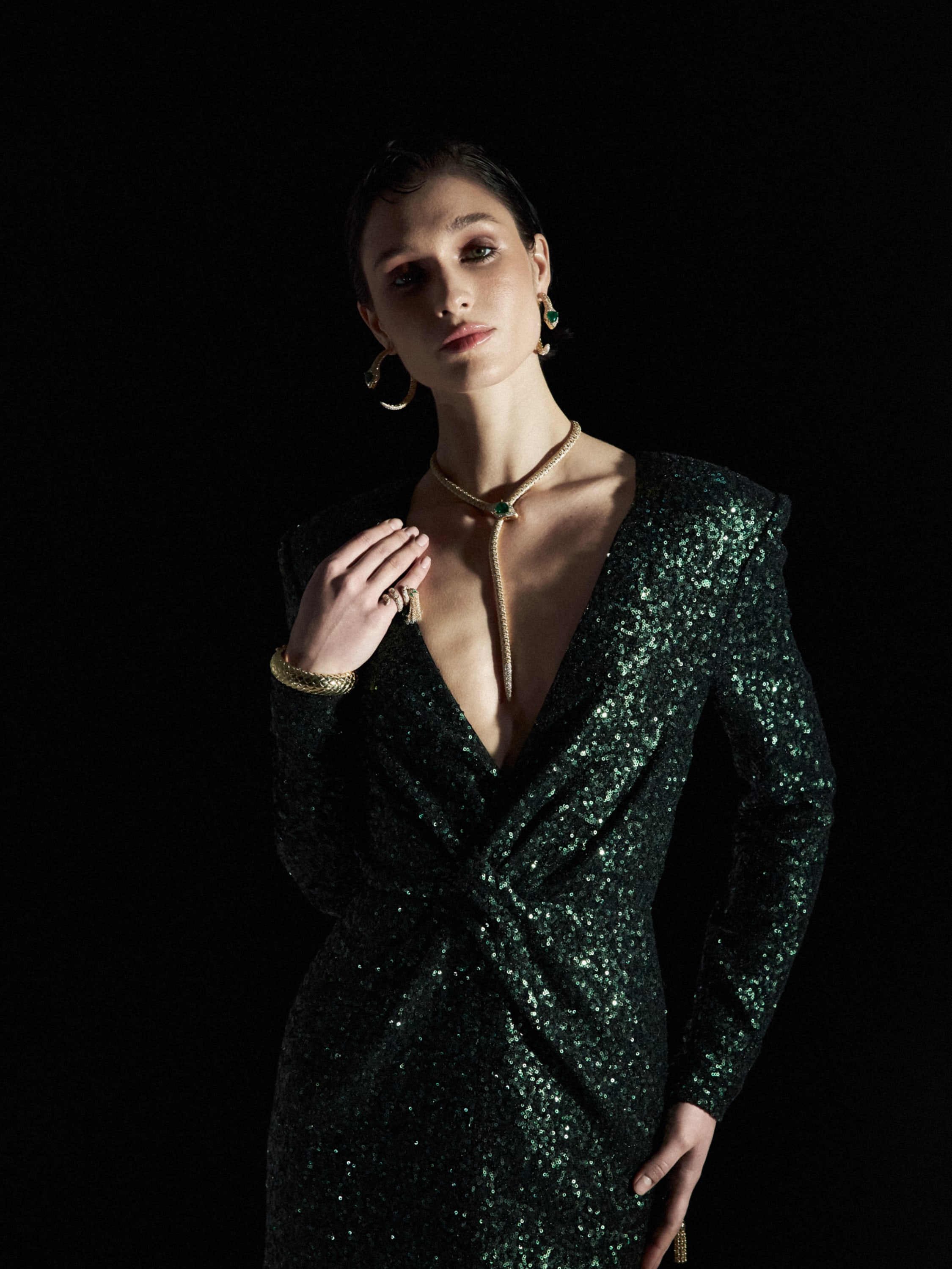 Yellow gold hand ring with diamonds and emerald