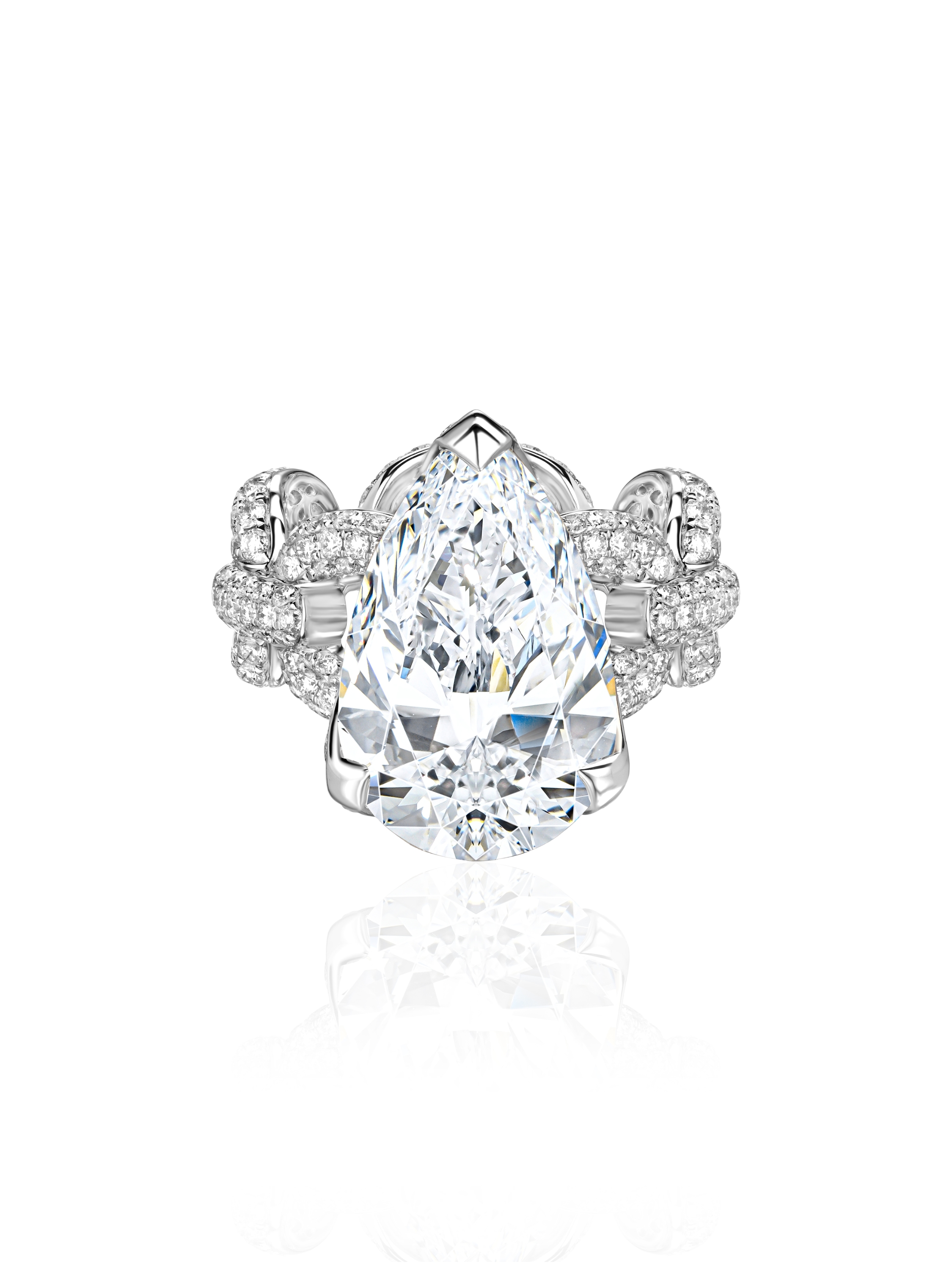 Ring with an LG pear-cut diamond of 11.69 ct F/VS1 and 302 round LG diamonds of 3.19 ct H/SI.