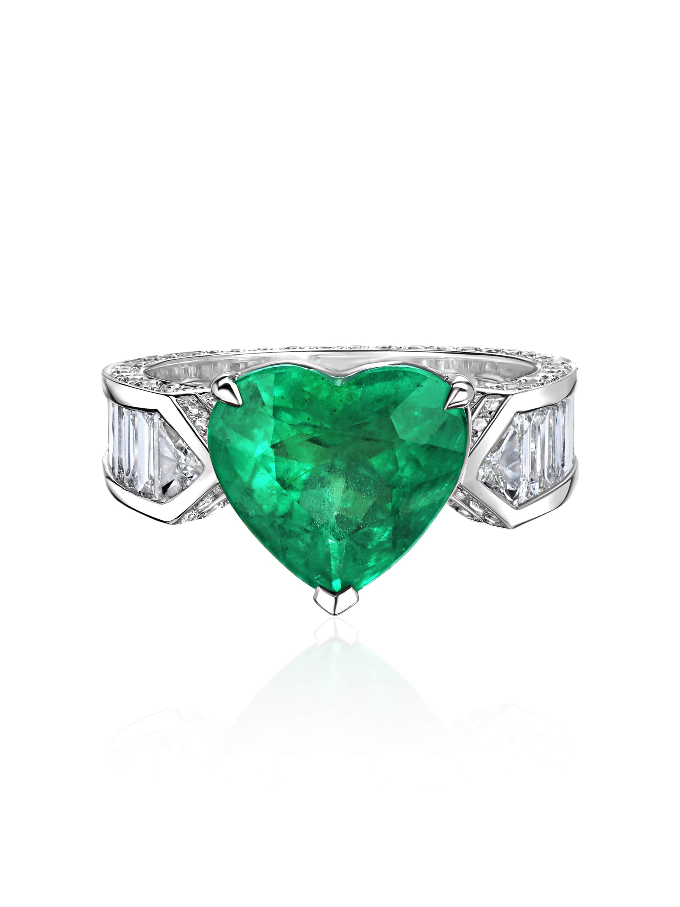Ring with heart-cut emerald weighing 2.82 ct, 2 fancy-cut diamonds weighing 0.27 ct, 28 baguette-cut diamonds weighing 1.51 ct and 134 round-cut diamonds weighing 0.77 ct.