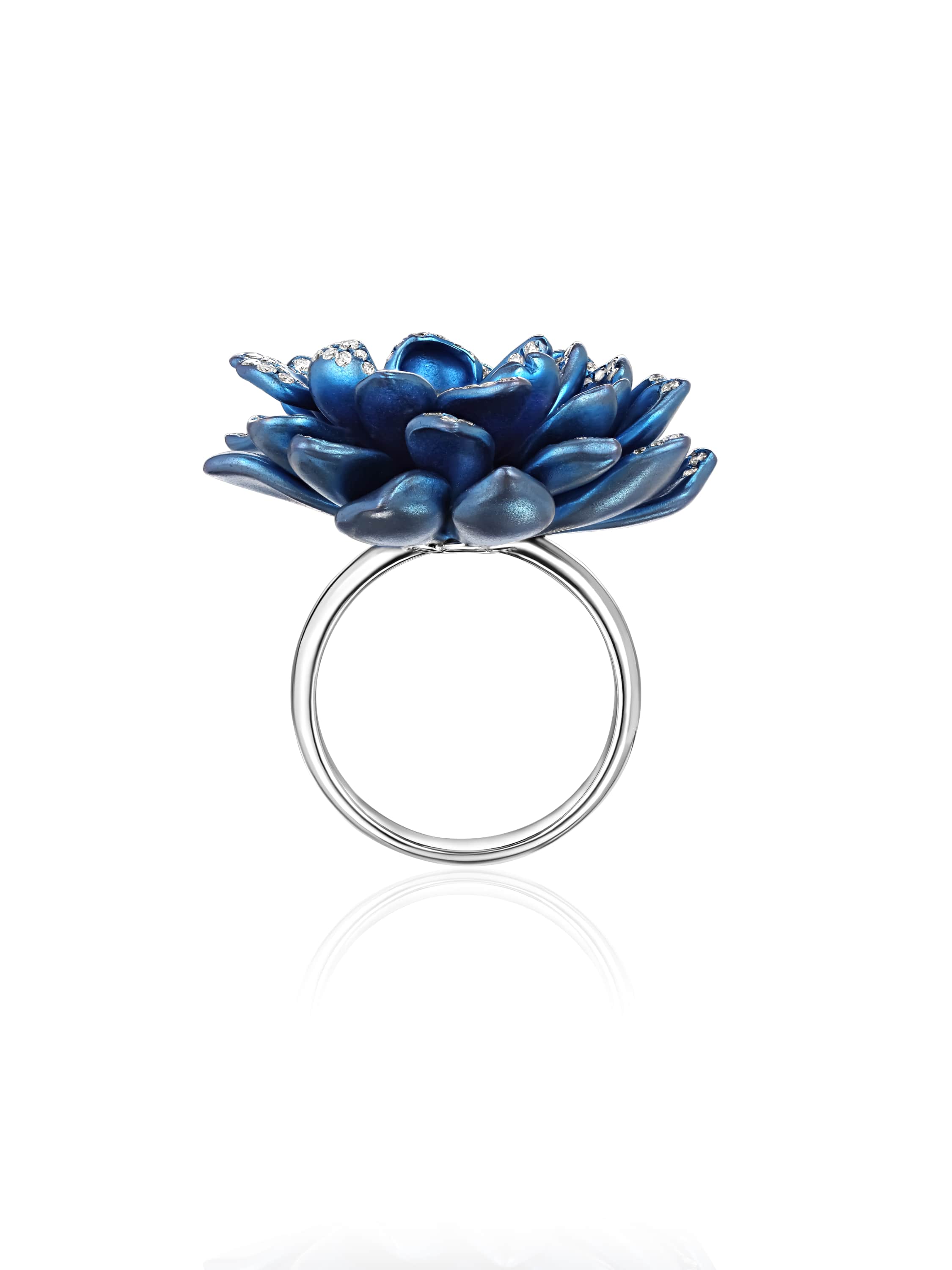 Flower‑shaped ring in titanium 7.77 g and 18K white gold with 150 round diamonds 0.78 ct and 1 Step Cut diamond 0.62 ct.