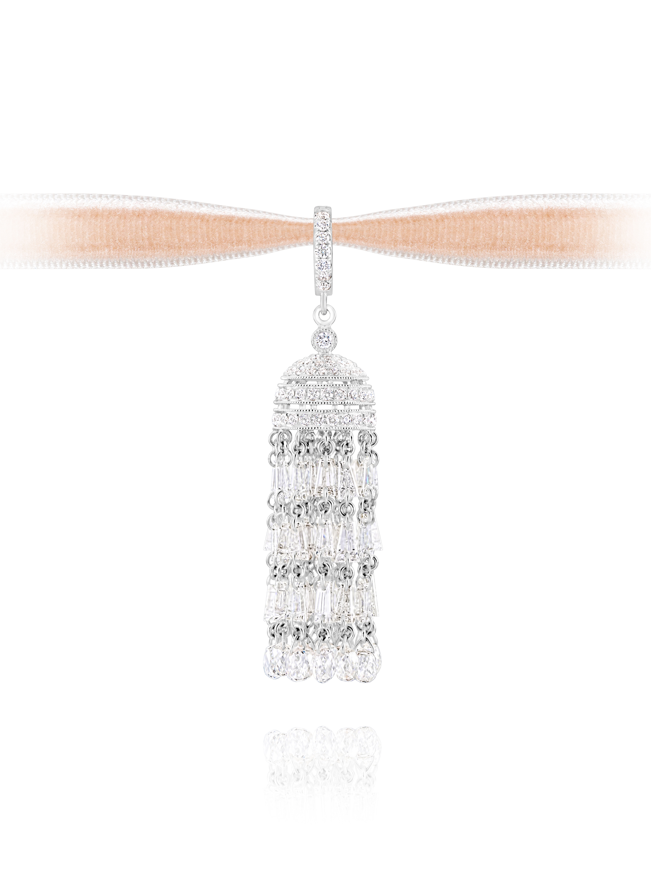 The iconic tassel pendant by Yana Jewellery is crafted from white gold with chains of diamonds in baguette, briolette and classic 57-facet round cuts. The total diamond weight in the piece is 7.27 ct.