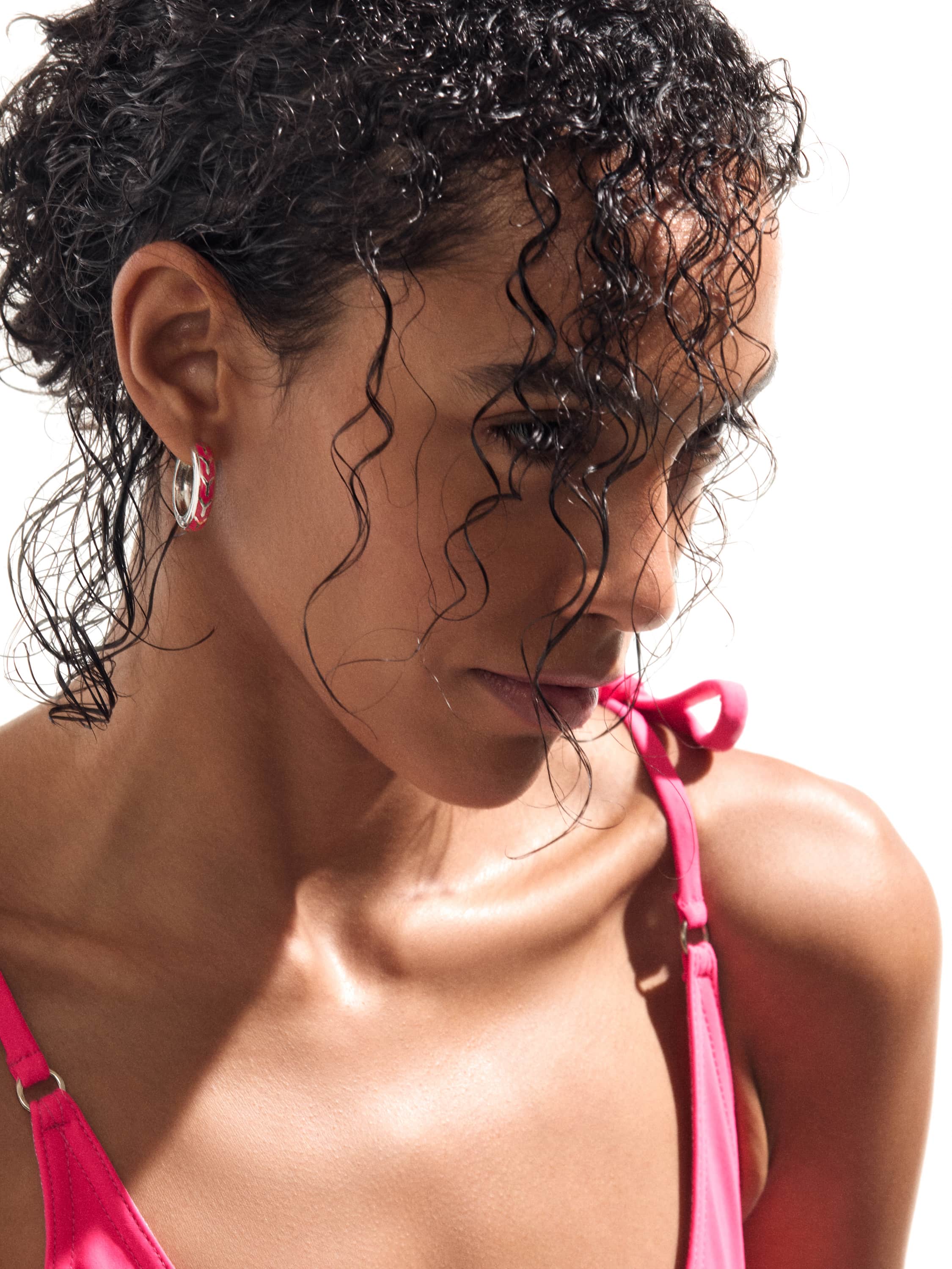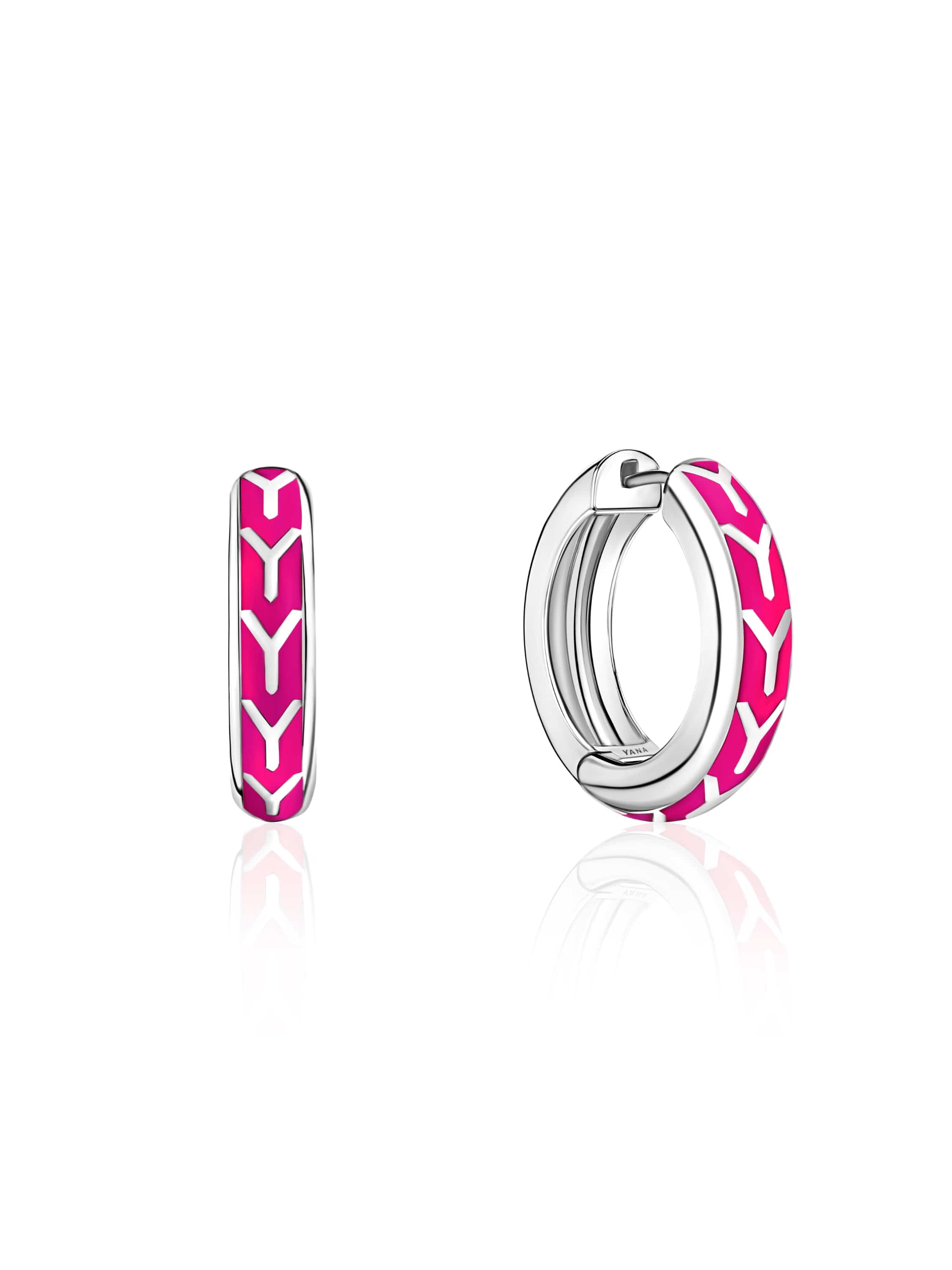 White gold hoops with pink enamel. Diameter: 2.5 cm.