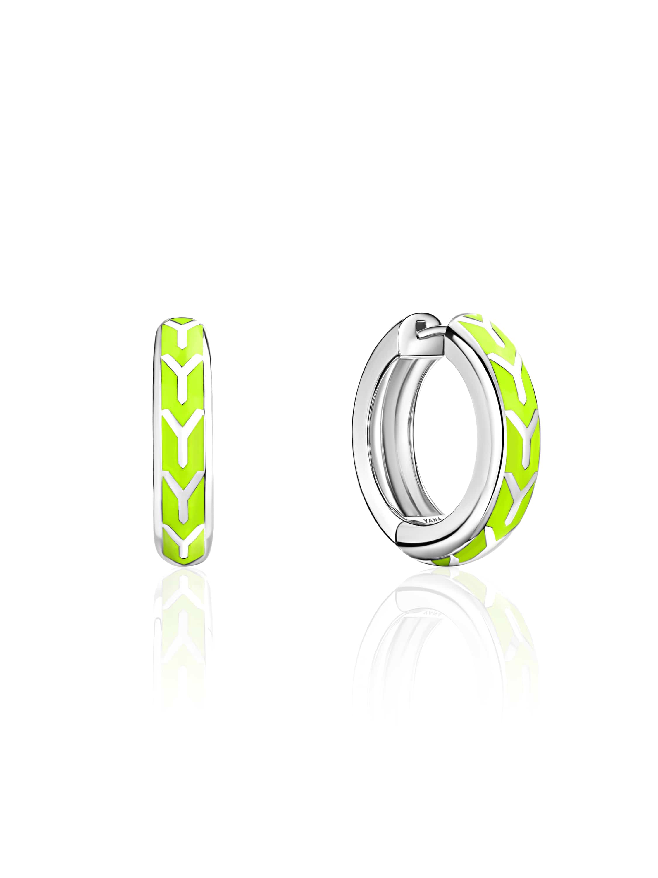 Hoops made of white gold with lime-colored enamel. Diameter: 2.5 cm.