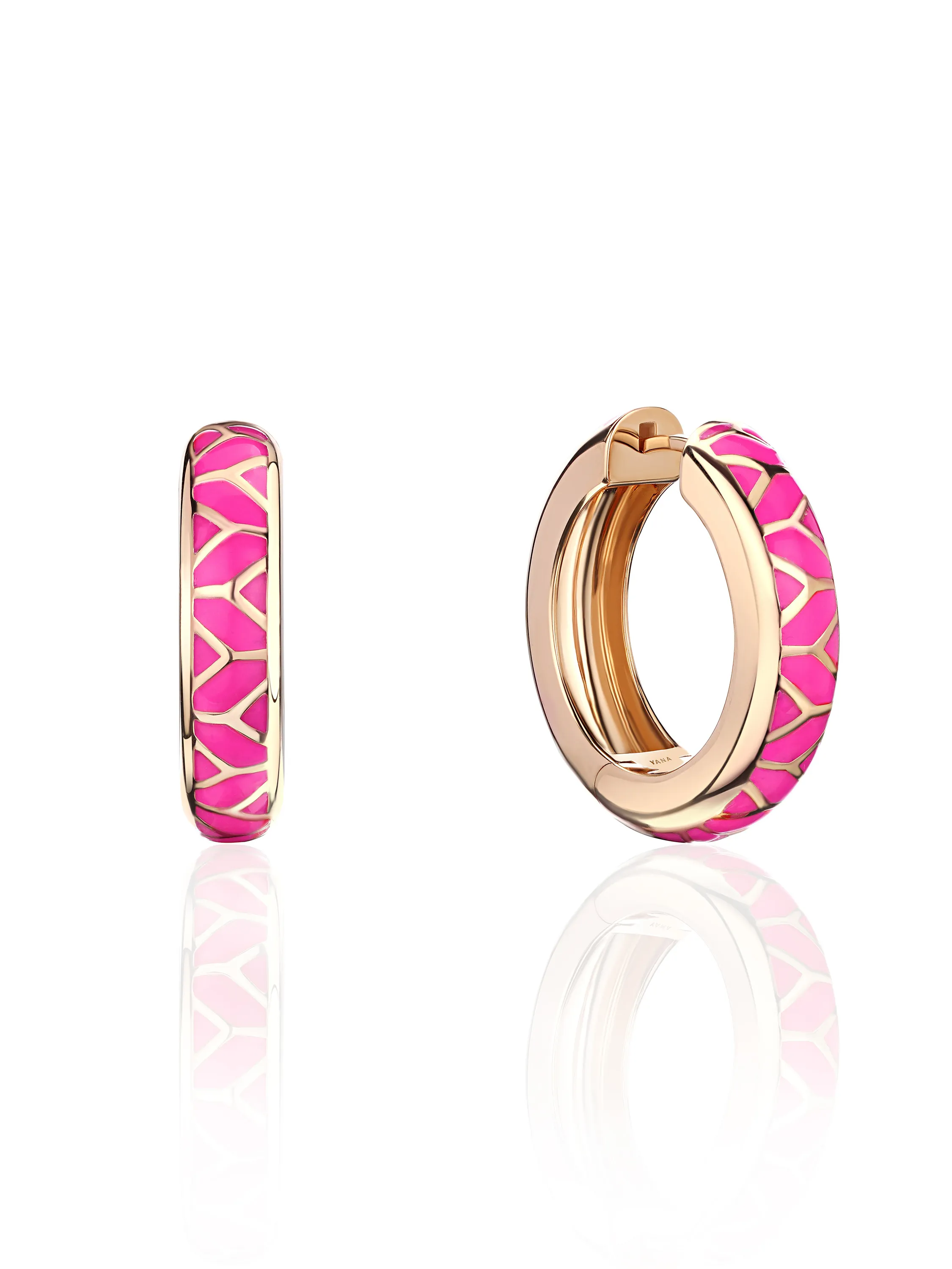 Rose gold hoops with pink-colored enamel. Diameter: 2.5 cm.