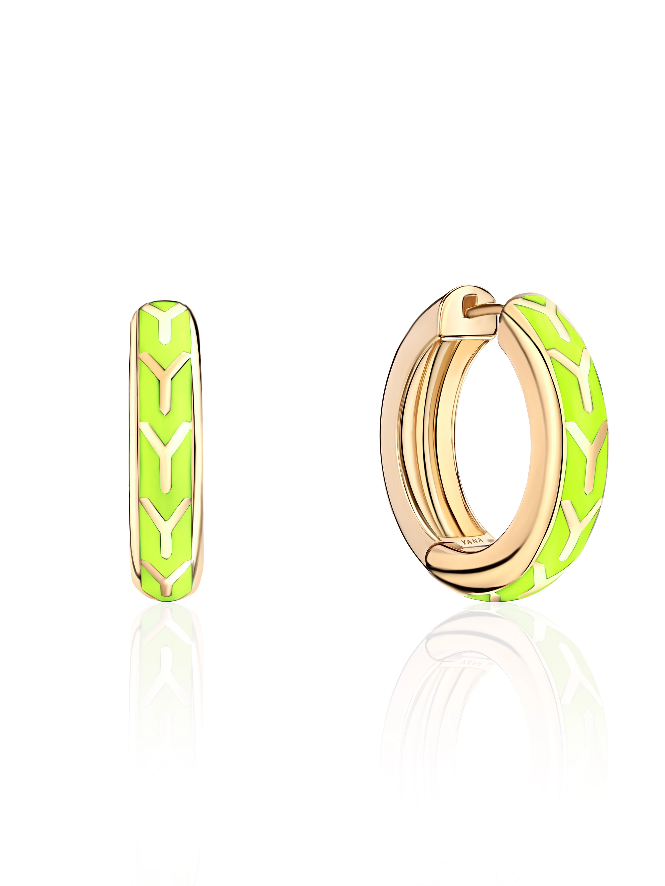 Small yellow gold hoops with lime-colored enamel. Diameter: 2.5 cm.