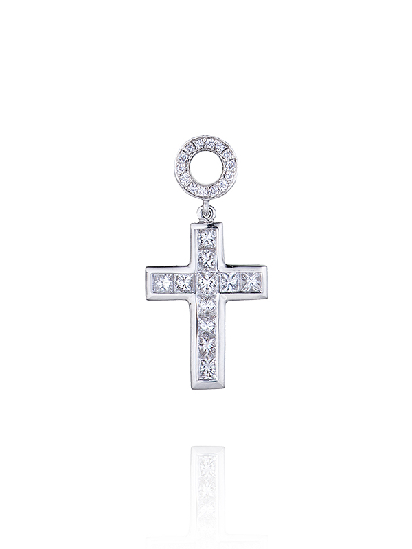 Hoop earring charm in the shape of a cross in white gold with 11 princess-cut diamonds with a total weight of 0.58 ct and 28 round-cut diamonds with a total weight of 0.11 ct.
