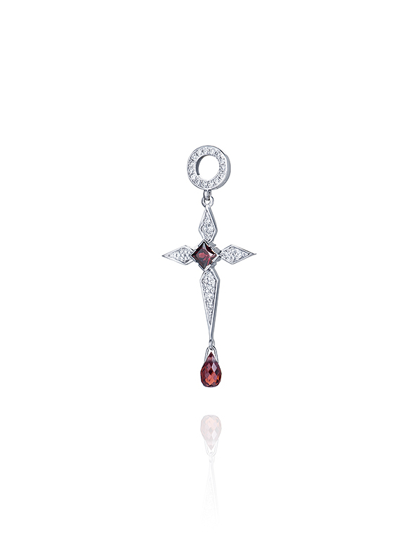 Hoop earring pendant in white gold with a briolette-cut garnet weighing 0.4 ct, a square-cut garnet weighing 0.21 ct, and 48 round-cut diamonds with a total weight of 0.14 ct.