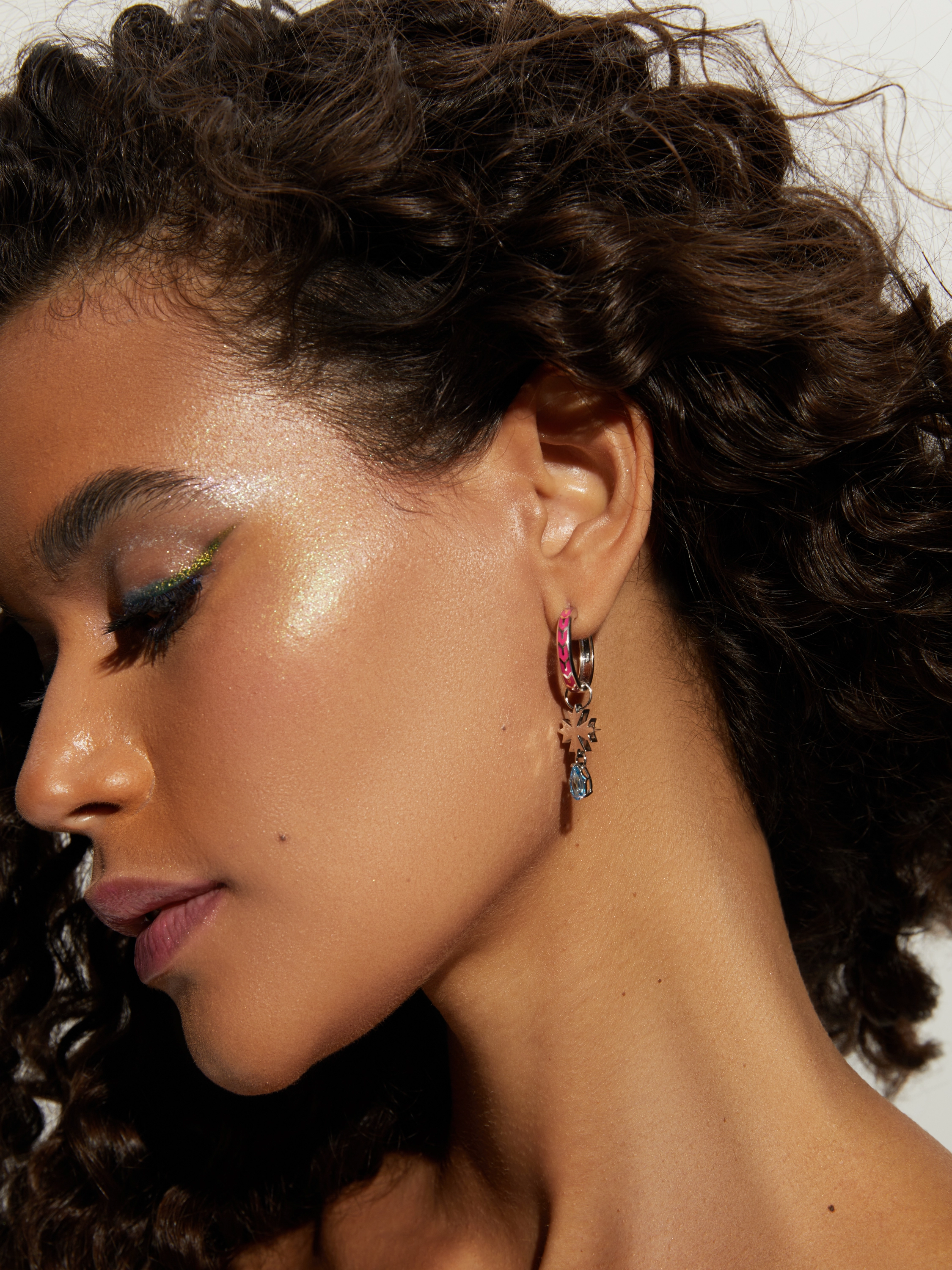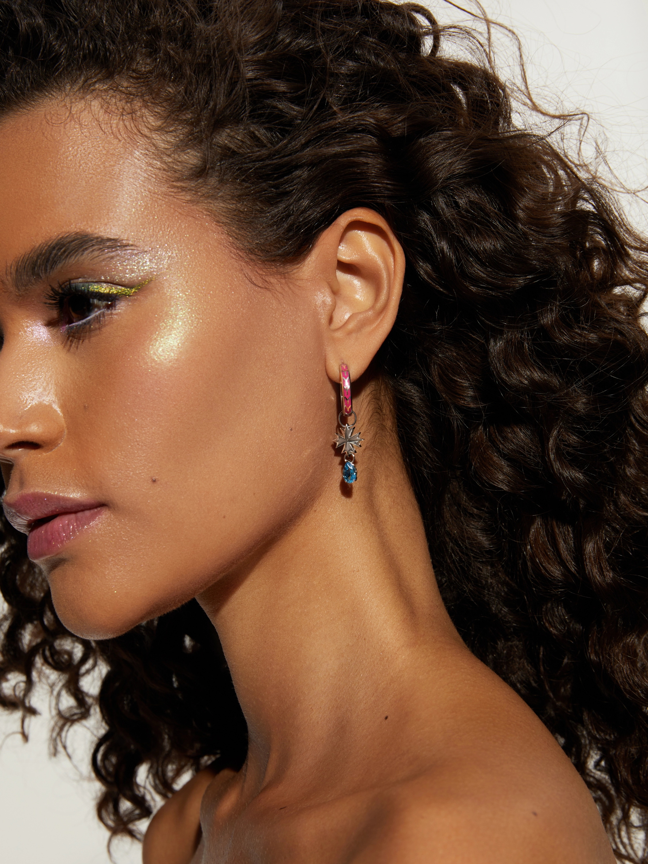 A white gold hoop earring charm with a cornflower and Sky Blue pear-cut topaz weighing 0.98 ct.