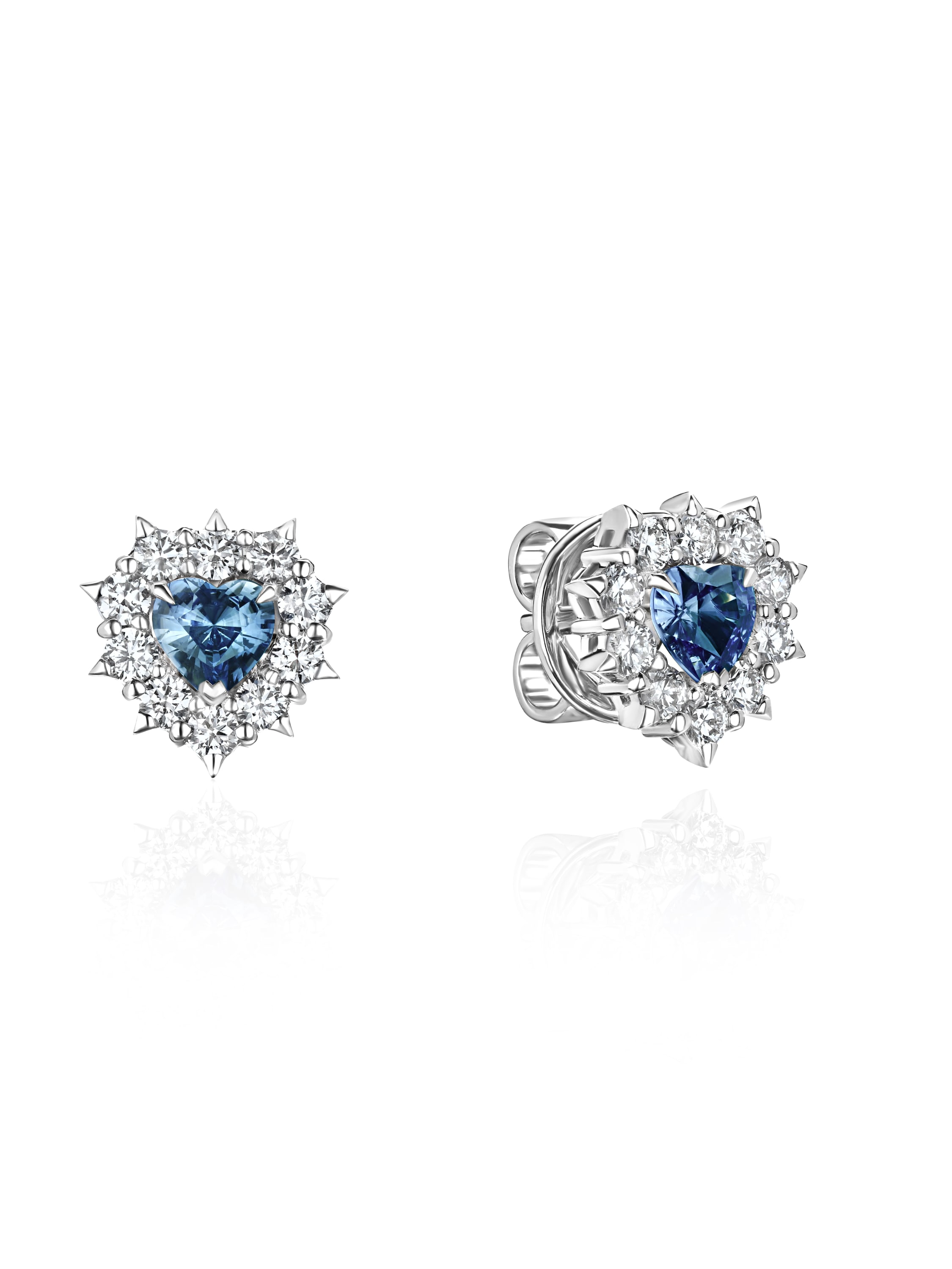 White gold stud earrings with heart-shaped sapphires and diamonds