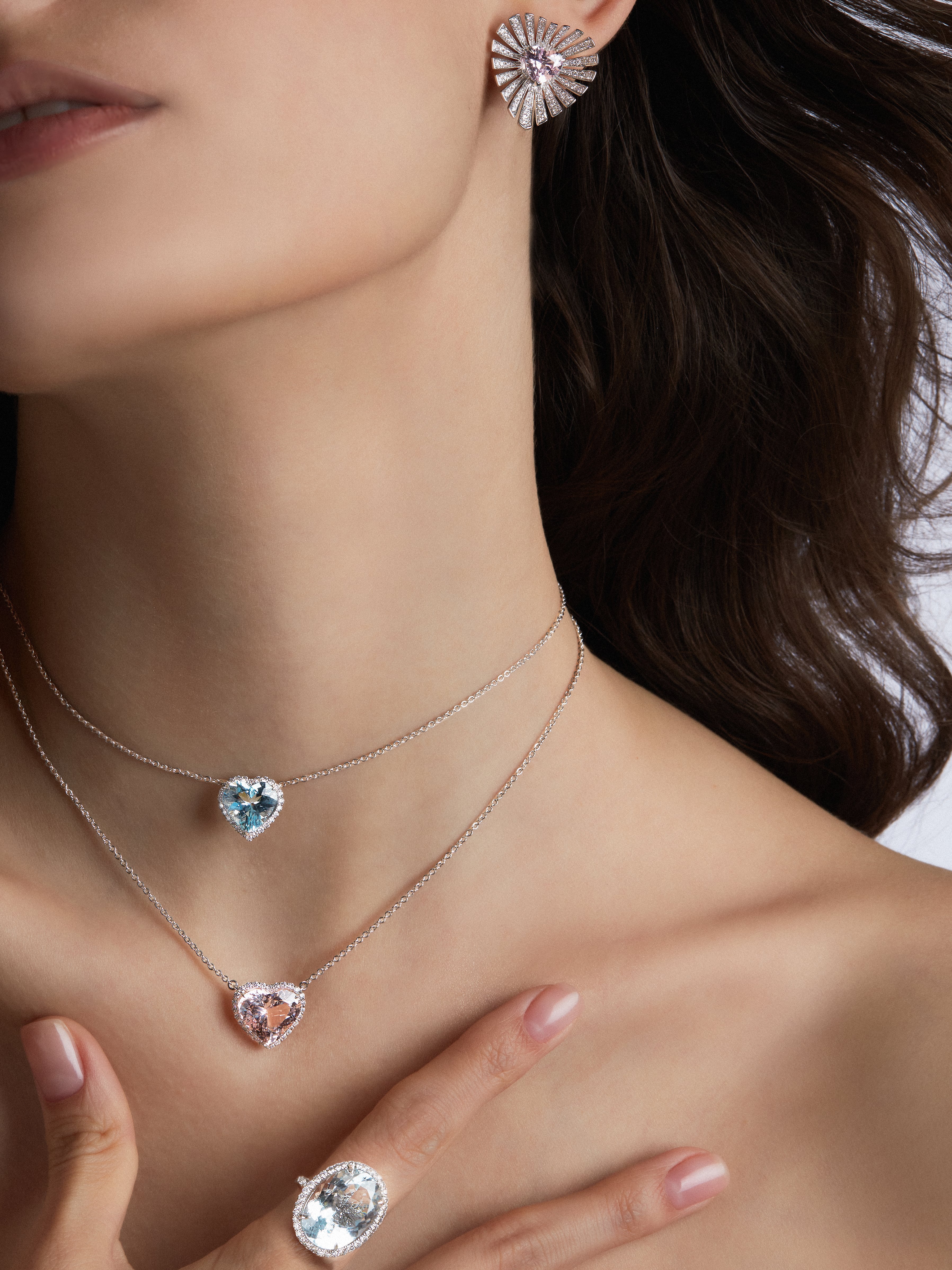 White gold stud earrings set with 2 heart-cut spinel crystals with a total weight of 2.88 ct and 222 round-cut diamonds with a total weight of 1.10 ct.