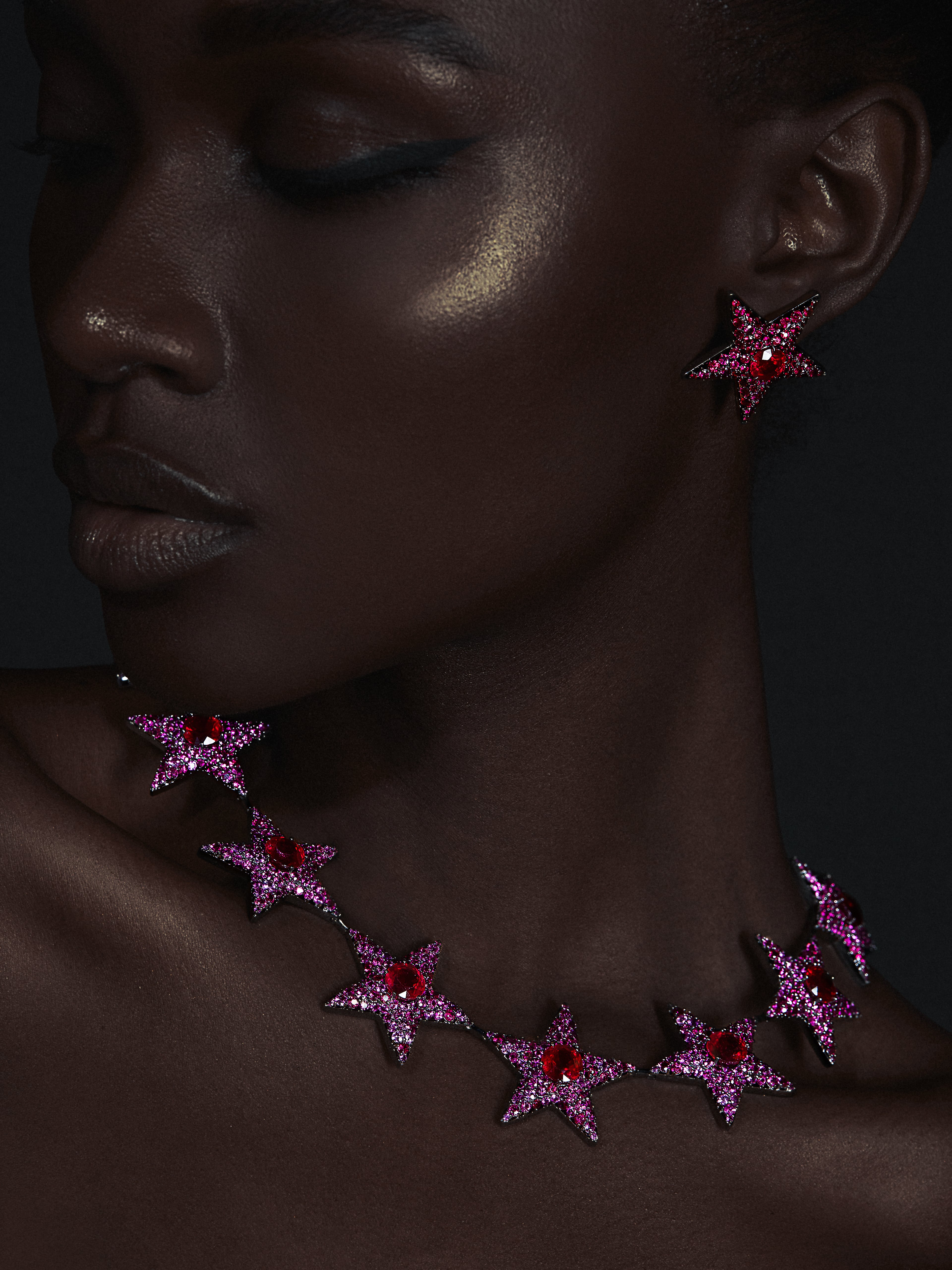 Star-shaped stud earrings in blackened gold, set with 142 round rubies with a total weight of 9.26 ct.
