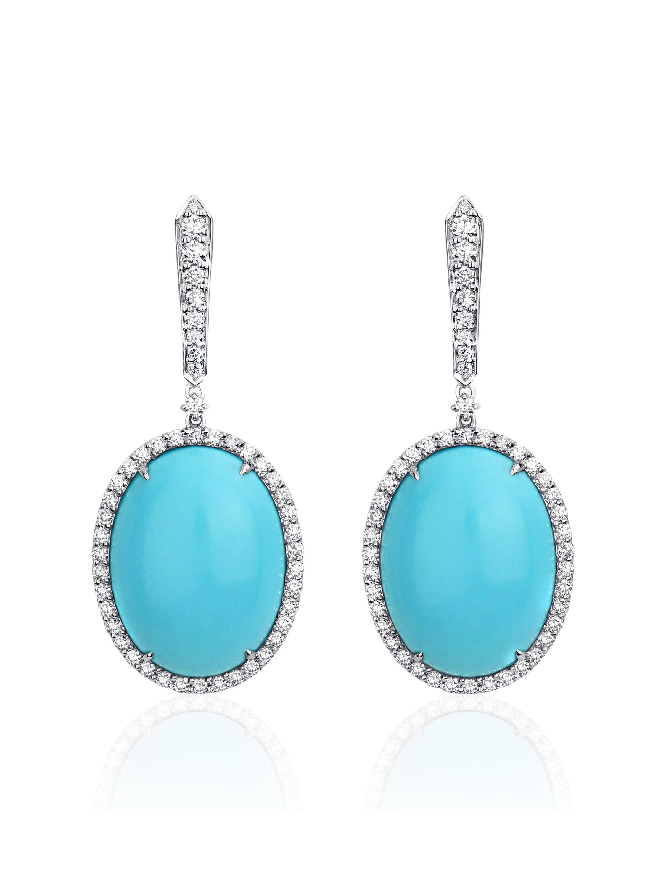 White gold earrings set with 96 round diamonds with a total weight of 1.31 ct and cabochon-cut turquoise with a total weight of 5.26 g. Item length 4 cm.