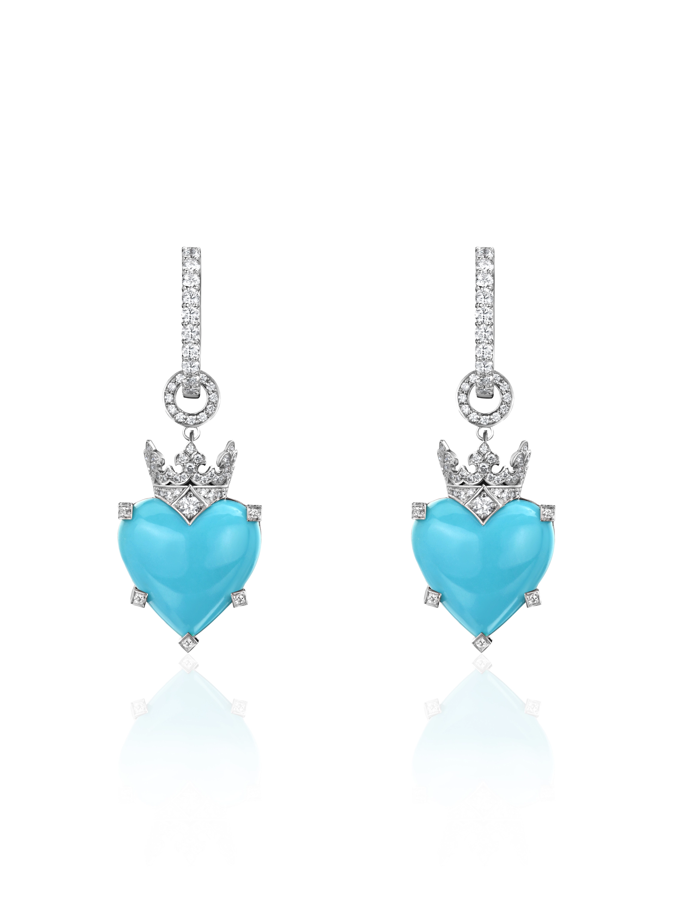 The earrings are made of 18K white gold with 2 heart-shaped turquoise stones weighing 2.28 g and 188 round-cut diamonds with a total weight of 1.35 ct. Item weight: 10.76 g. Item length: 4 cm.