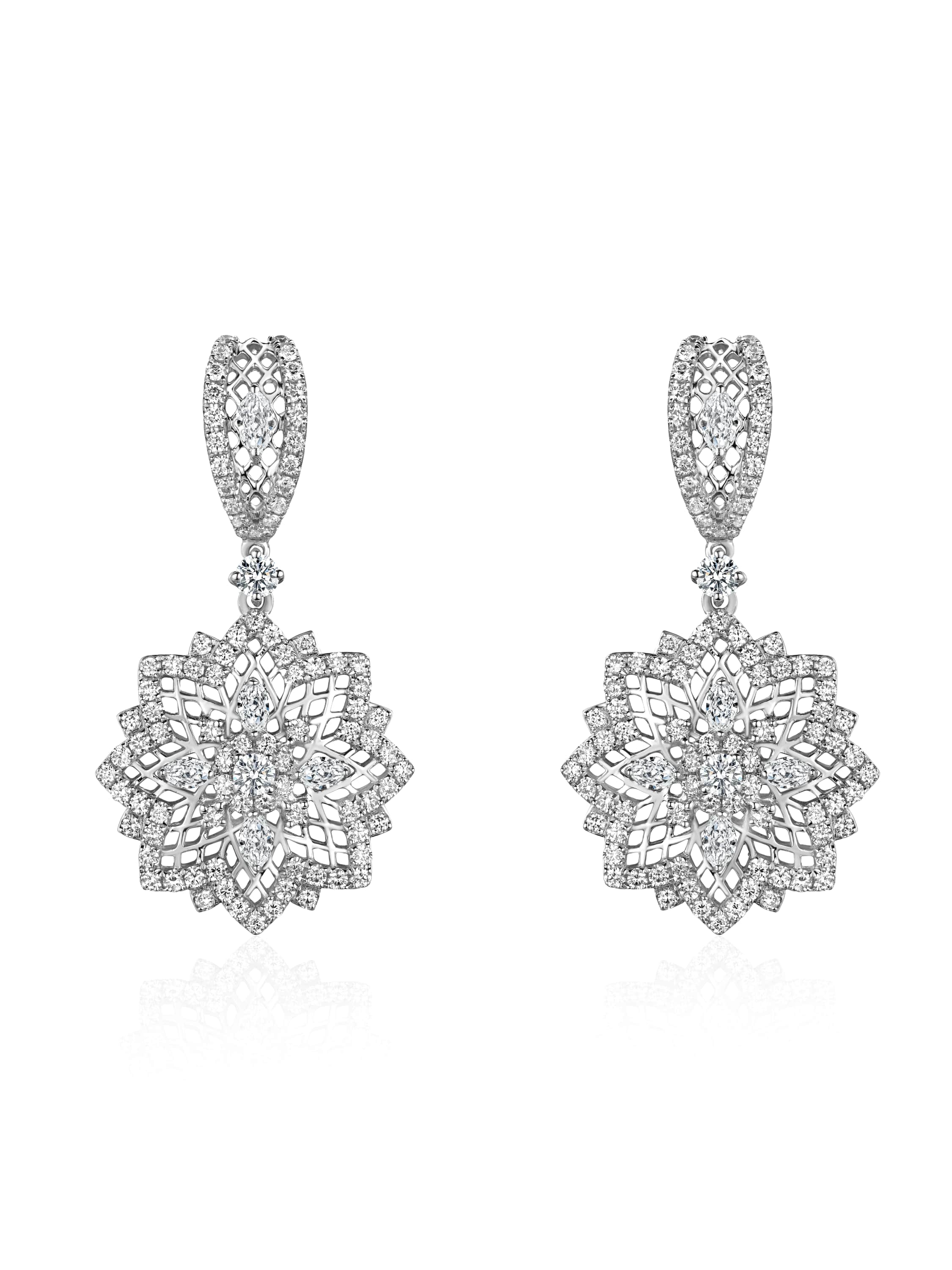 White gold earrings with 184 round-cut diamonds weighing 1.78 ct and 10 marquise-cut diamonds weighing 0.54 ct.