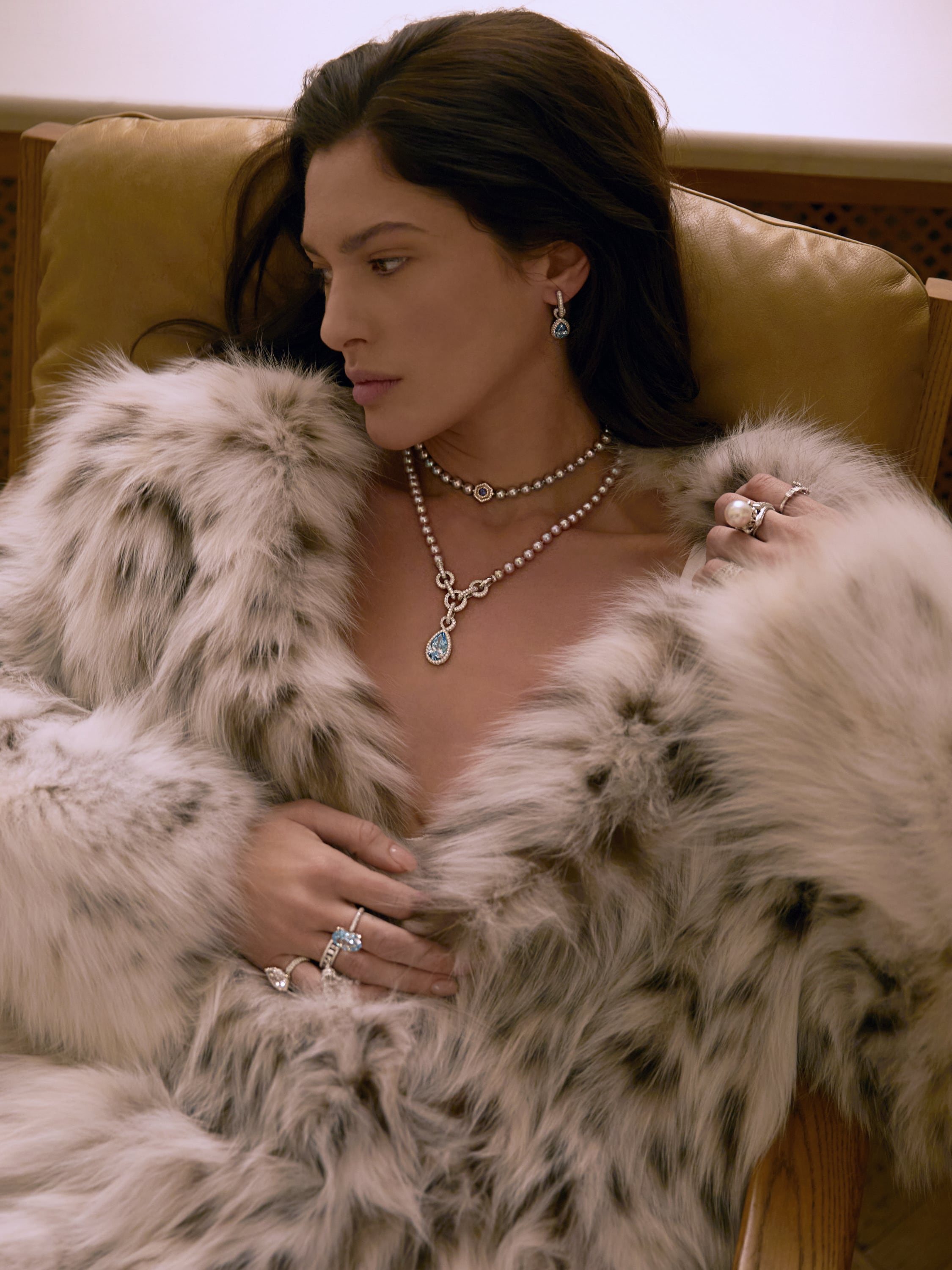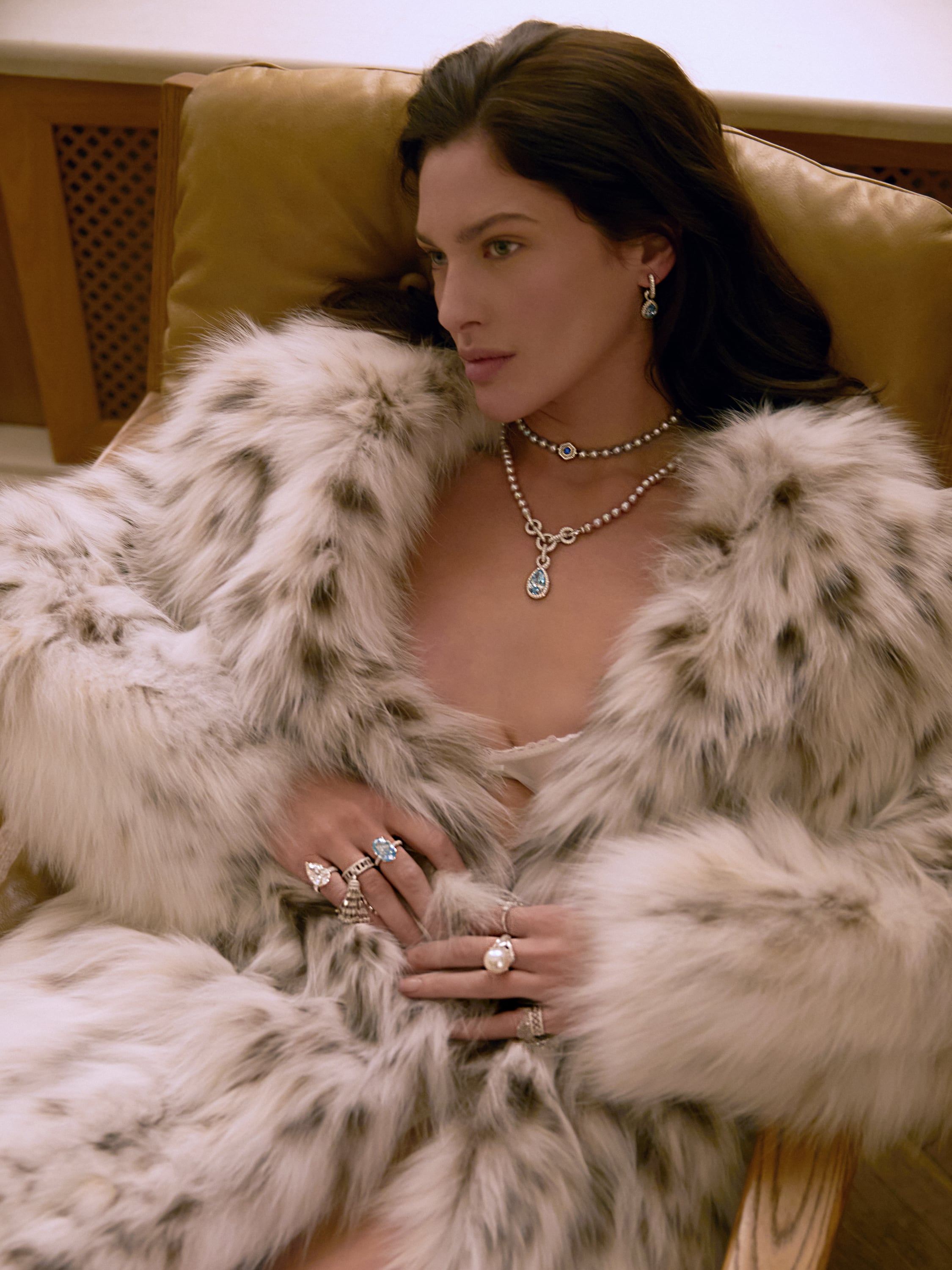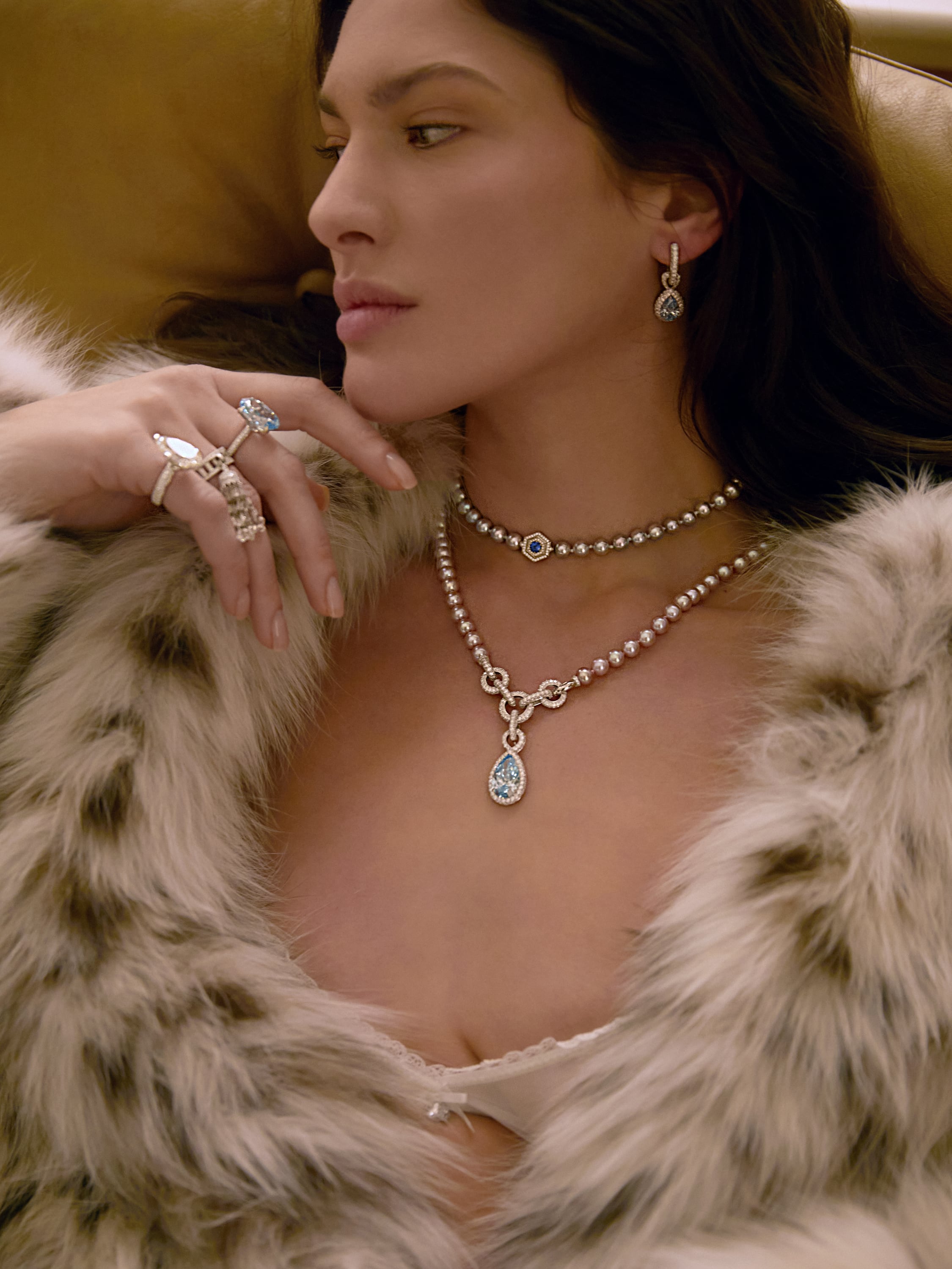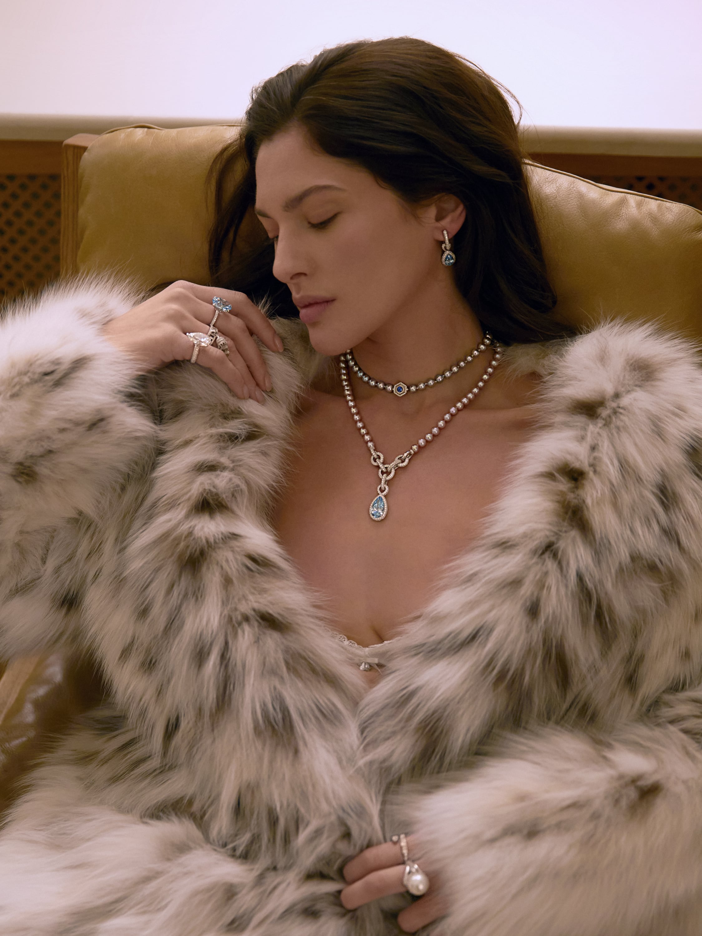 White gold earrings with 1 blue lab-grown diamond 2.52 ct VS1, 1 blue pear-cut lab-grown diamond 2.52 ct VVS2 and 178 round diamonds weighing 2.44 ct. Item length: 3.5 cm.