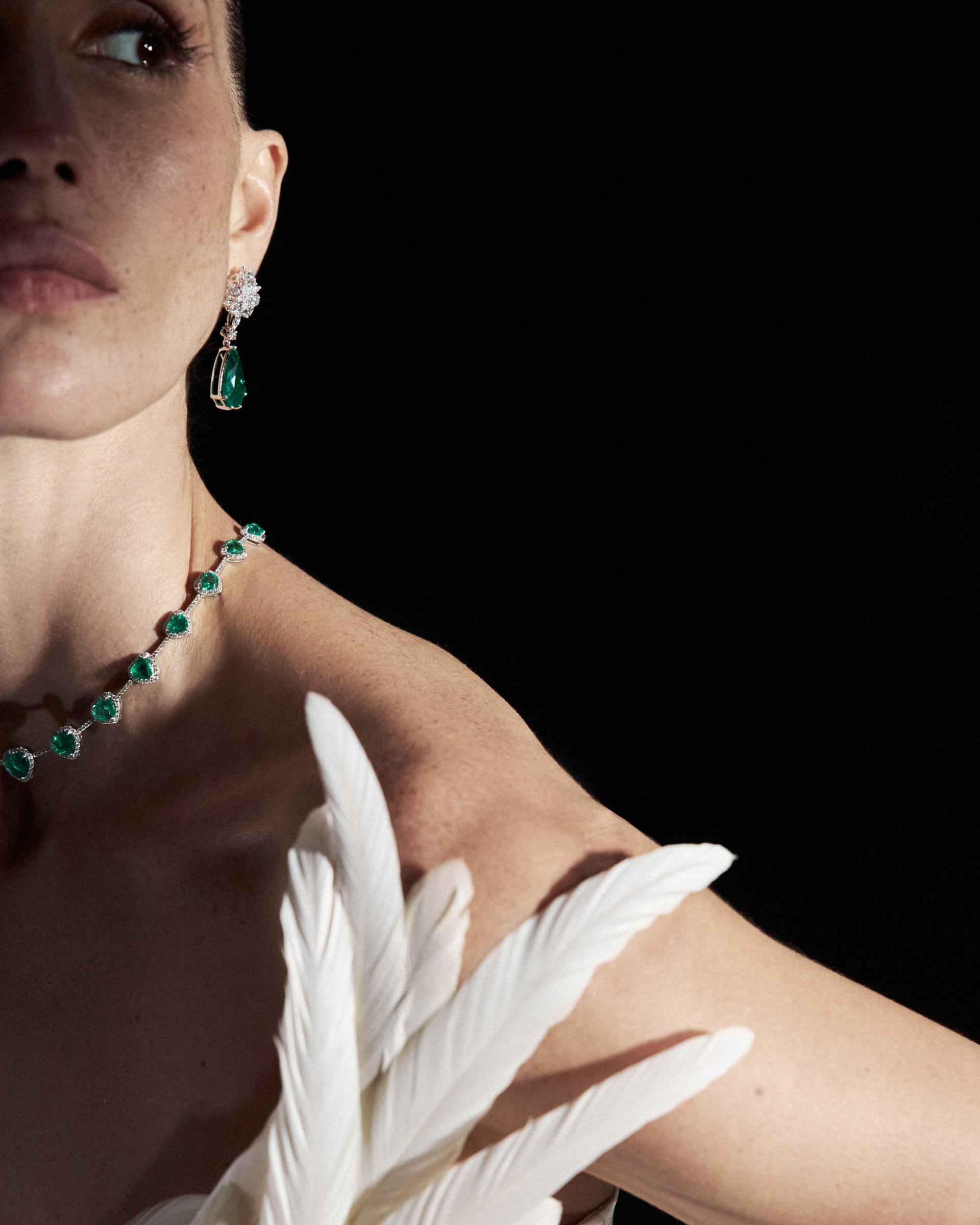 White gold earrings with 2 pear-cut emeralds, 22 pear-cut diamonds, 4 round-cut diamonds with a total weight of 0.22 ct and 10 marquise-cut diamonds with a total weight of 0.9 ct. Item length: 4 cm.