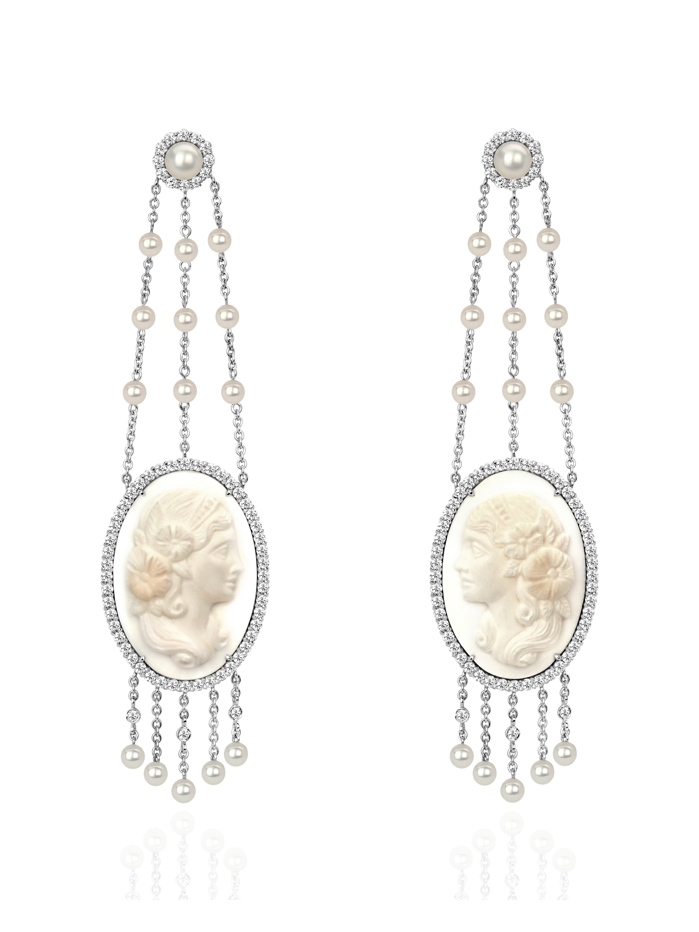 White gold earrings set with 2 cameos on shell with a total weight of 8.30 g, 30 pearls with a total weight of 1.19 ct and 128 round diamonds with a total weight of 1.94 ct.