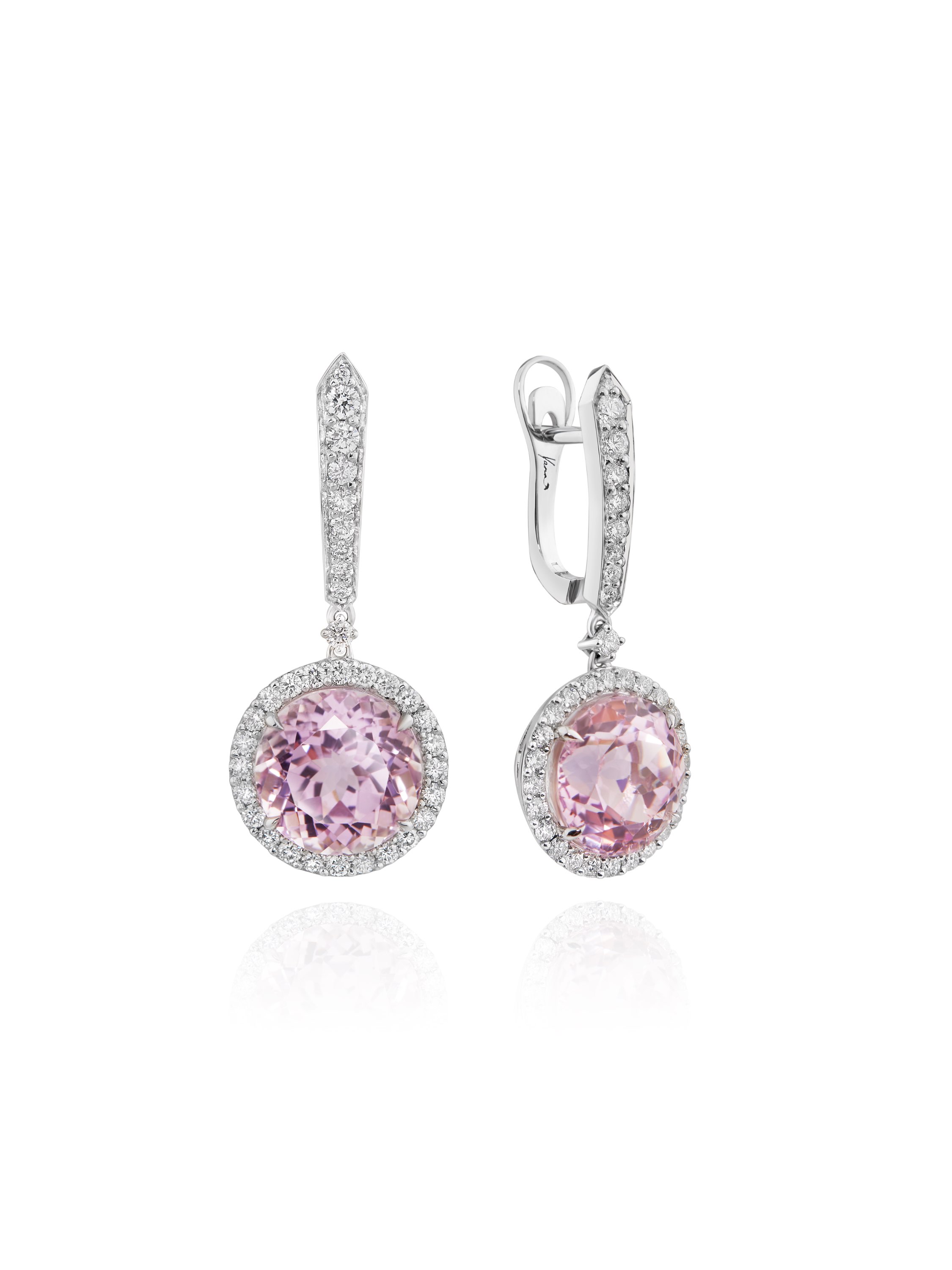 18K white gold earrings with 2 round kunzites weighing 12.14 ct and 68 round-cut diamonds weighing 1.07 ct. Item length: 3 cm.