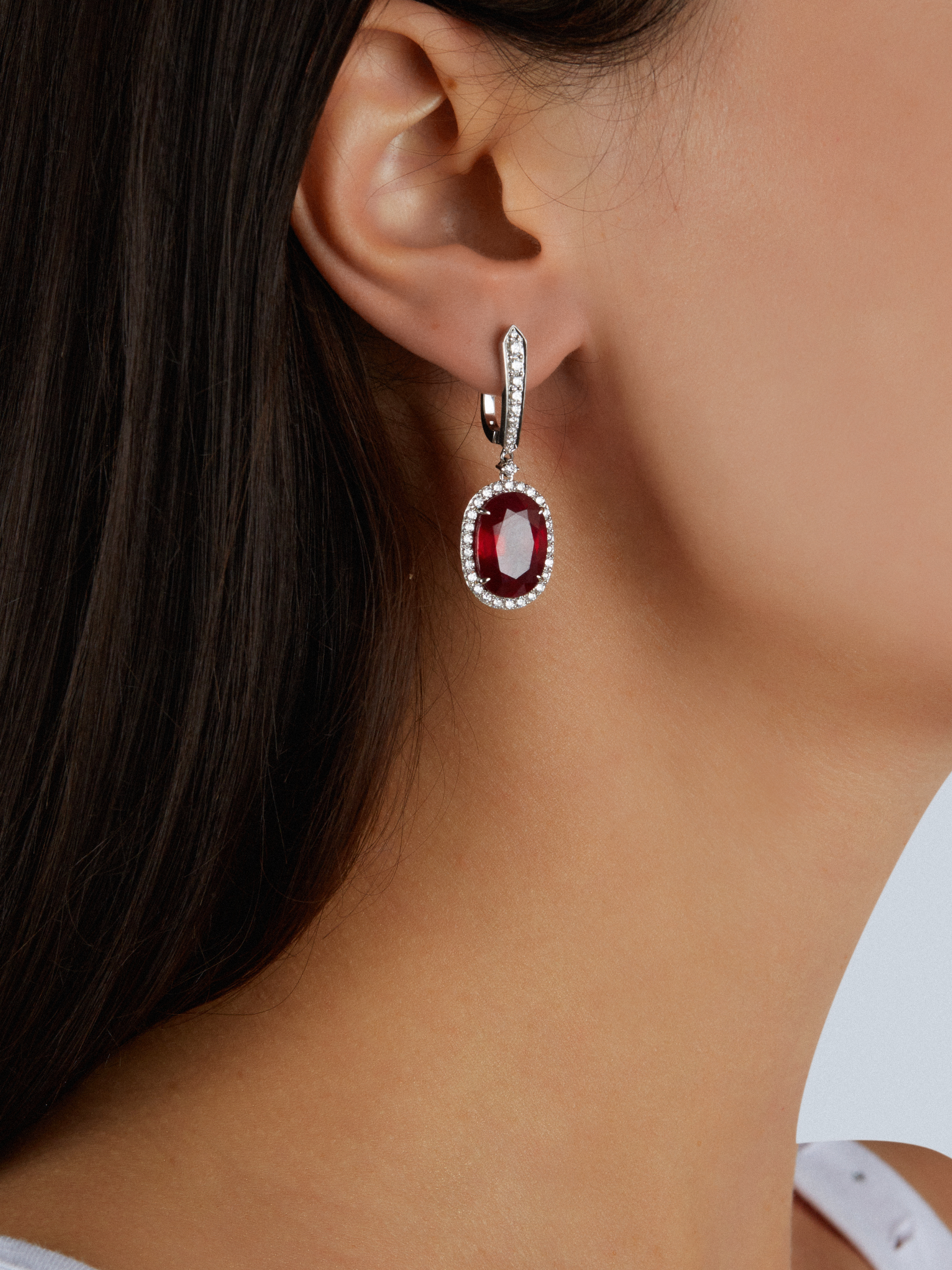 White gold earrings with 2 oval-cut rubies weighing 18.13 ct and 72 round-cut diamonds weighing 1.13 ct. Length of the piece: 3.5 cm.