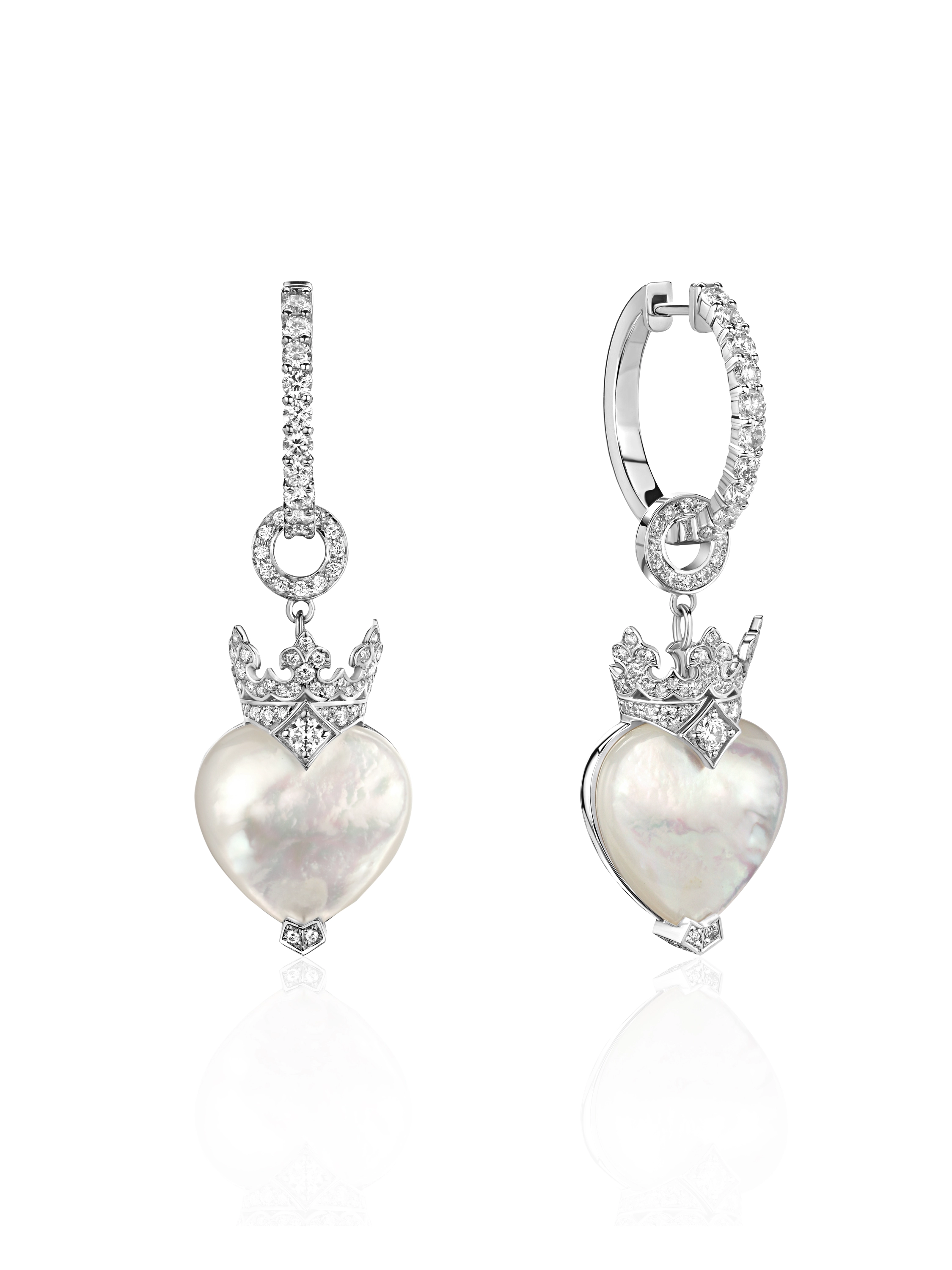 Transformer earrings crafted from 18K white gold with pendants of 2 heart-shaped mother-of-pearl stones weighing 11.60 ct and 136 round-cut diamonds with a total weight of 1.10 ct. Item weight: 9.98 g. Item length: 4 cm.