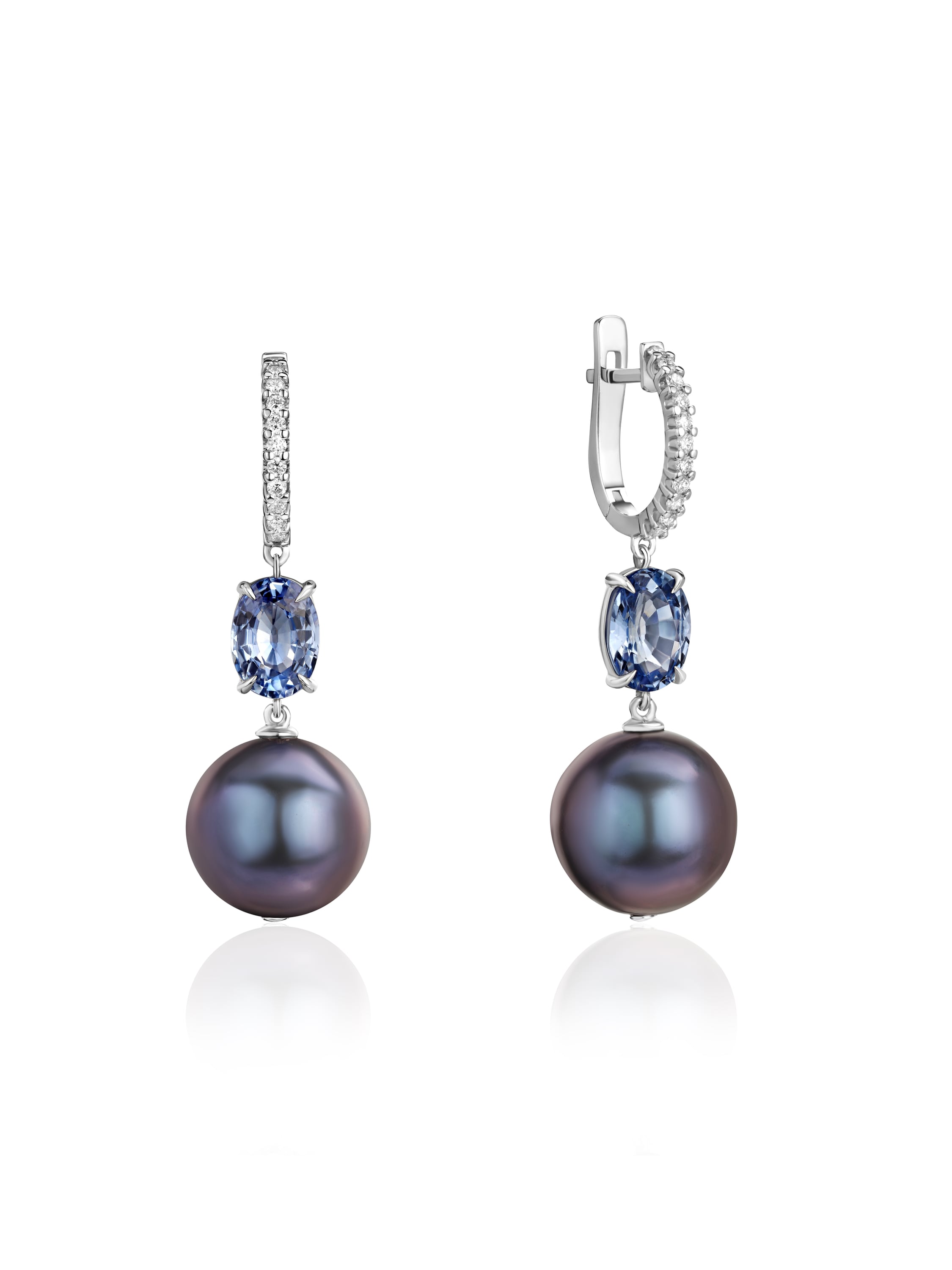 Earrings made of white gold with 2 oval sapphires with a total weight of 2.22 ct, 2 black pearls with a total weight of 3.41 g, and 22 round-cut diamonds with a total weight of 0.13 ct.