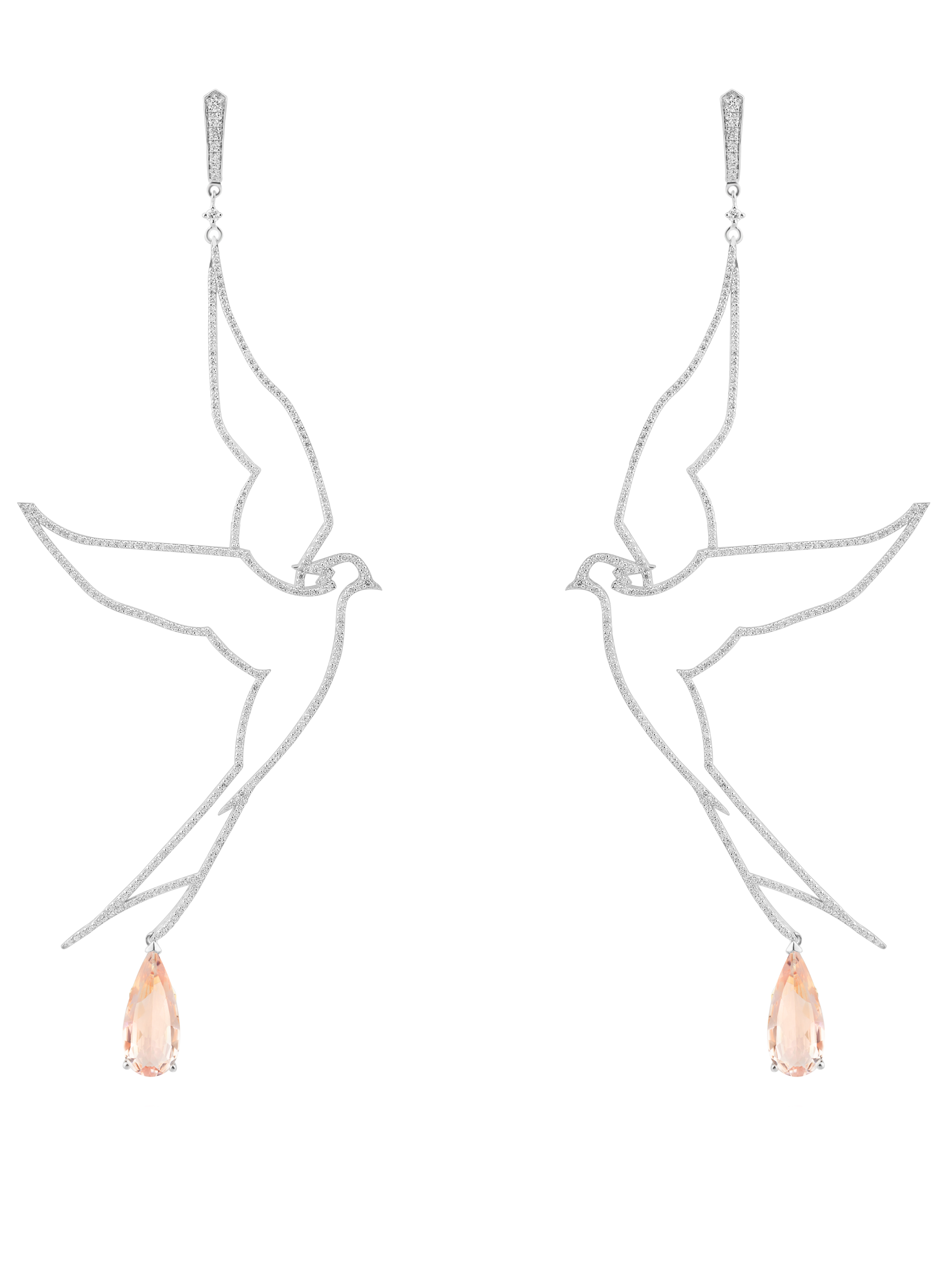 White gold bird-shaped earrings with 2 pear-cut morganites weighing 3.91 ct and 656 round diamonds weighing 1.88 ct. Item length: 11.5 cm.