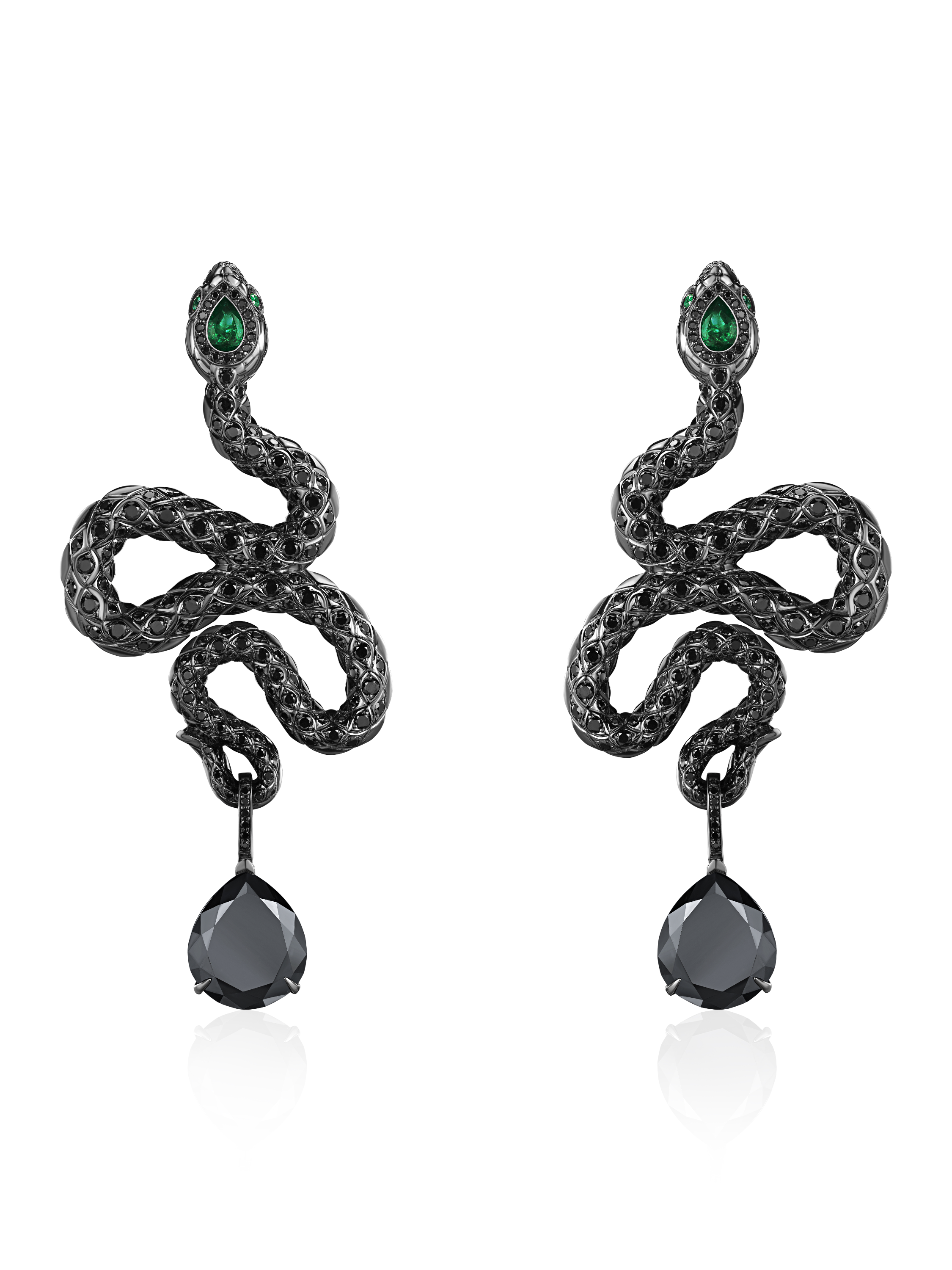 Earrings in 18K blackened gold with 2 pear-cut black diamonds weighing 16.33 ct, 2 pear-cut emeralds weighing 0.70 ct, 4 round emeralds 0.06 ct 3/3, and 300 round-cut diamonds weighing 3.28 ct. Item length: 7.5 cm.