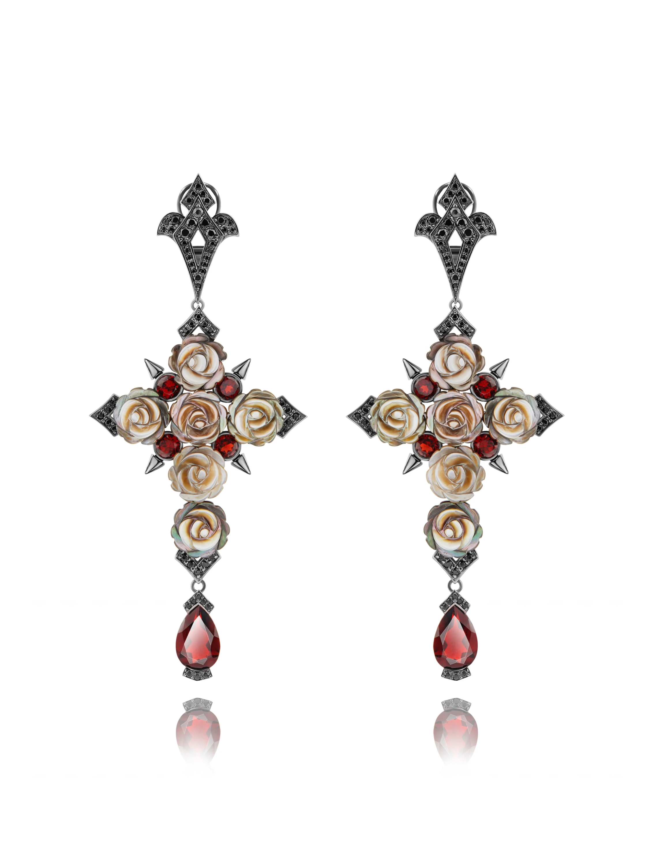 Earrings made of blackened gold with 12 rose-cut mother-of-pearls with a total weight of 18.4 ct, 2 pear-cut garnets with a total weight of 2.67 ct, 8 round-cut garnets with a total weight of 1.30 ct, and 116 black spinel stones with a total weight of 0.51 ct. Item length — 7 cm.