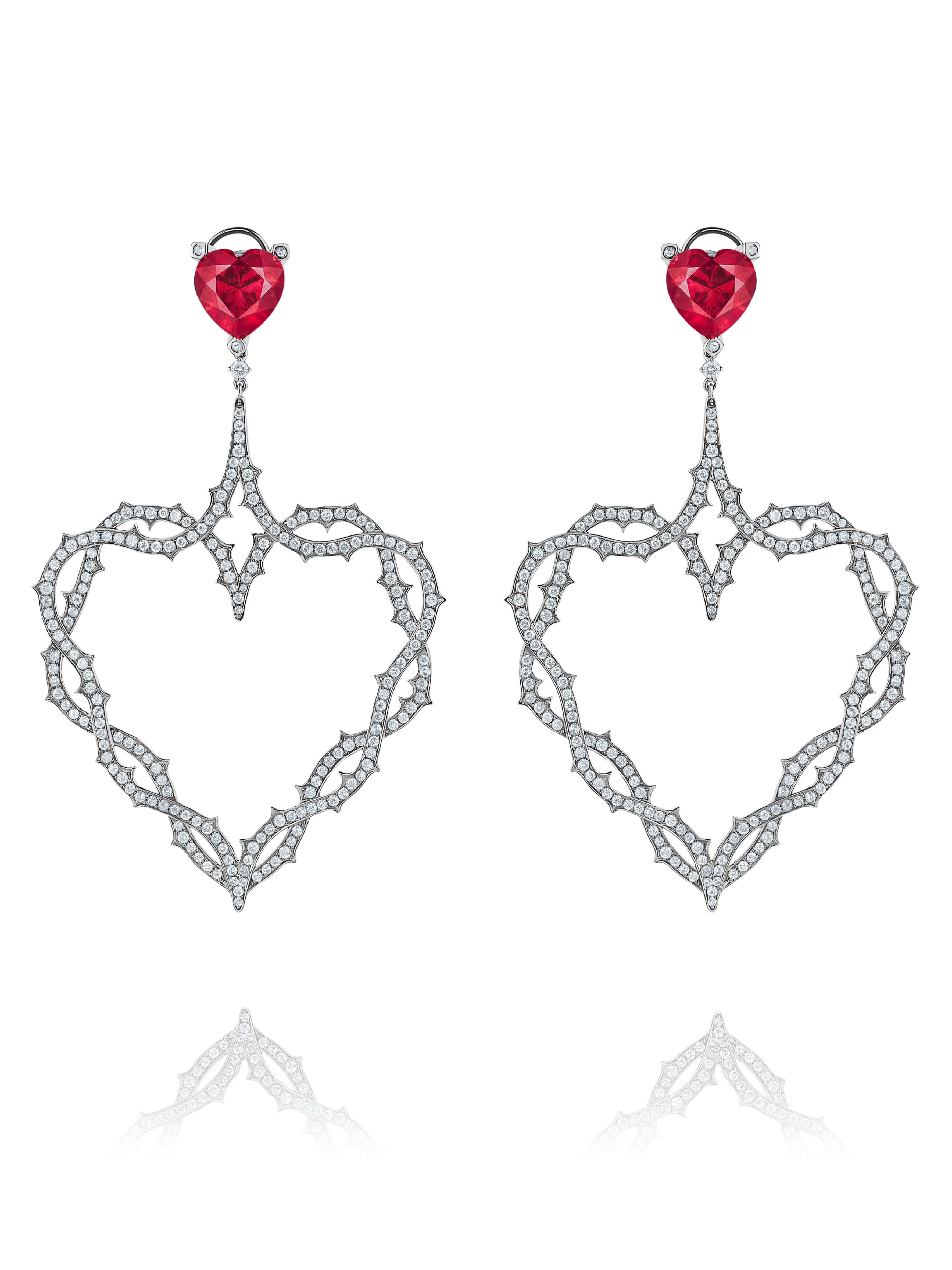 Earrings made of blackened gold, set with 2 heart-cut rubies with a total weight of 10.44 ct and 464 grey diamonds with a total weight of 3.77 ct.