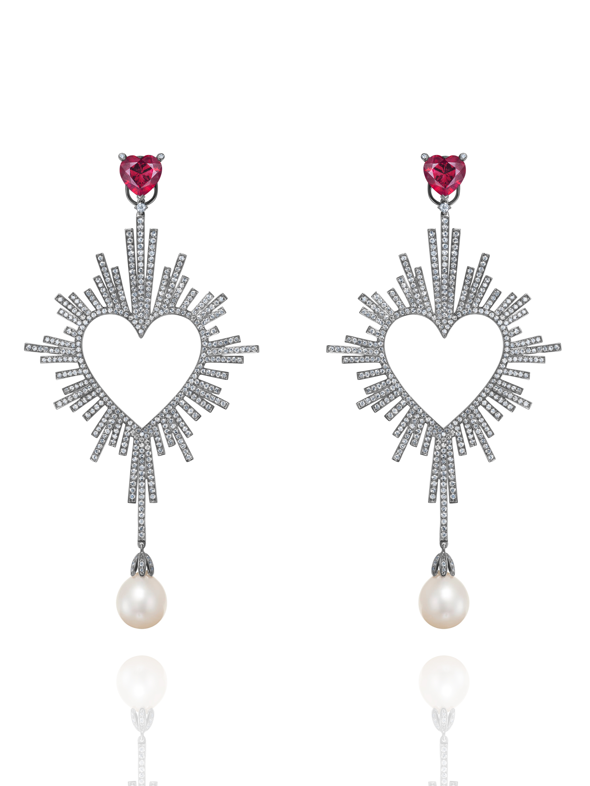 Blackened gold earrings set with 2 heart-cut rubies with a total weight of 7.41 ct, 2 pearls weighing 4.04 g, and 878 round gray diamonds with a total weight of 5.34 ct. Item length: 10 cm.