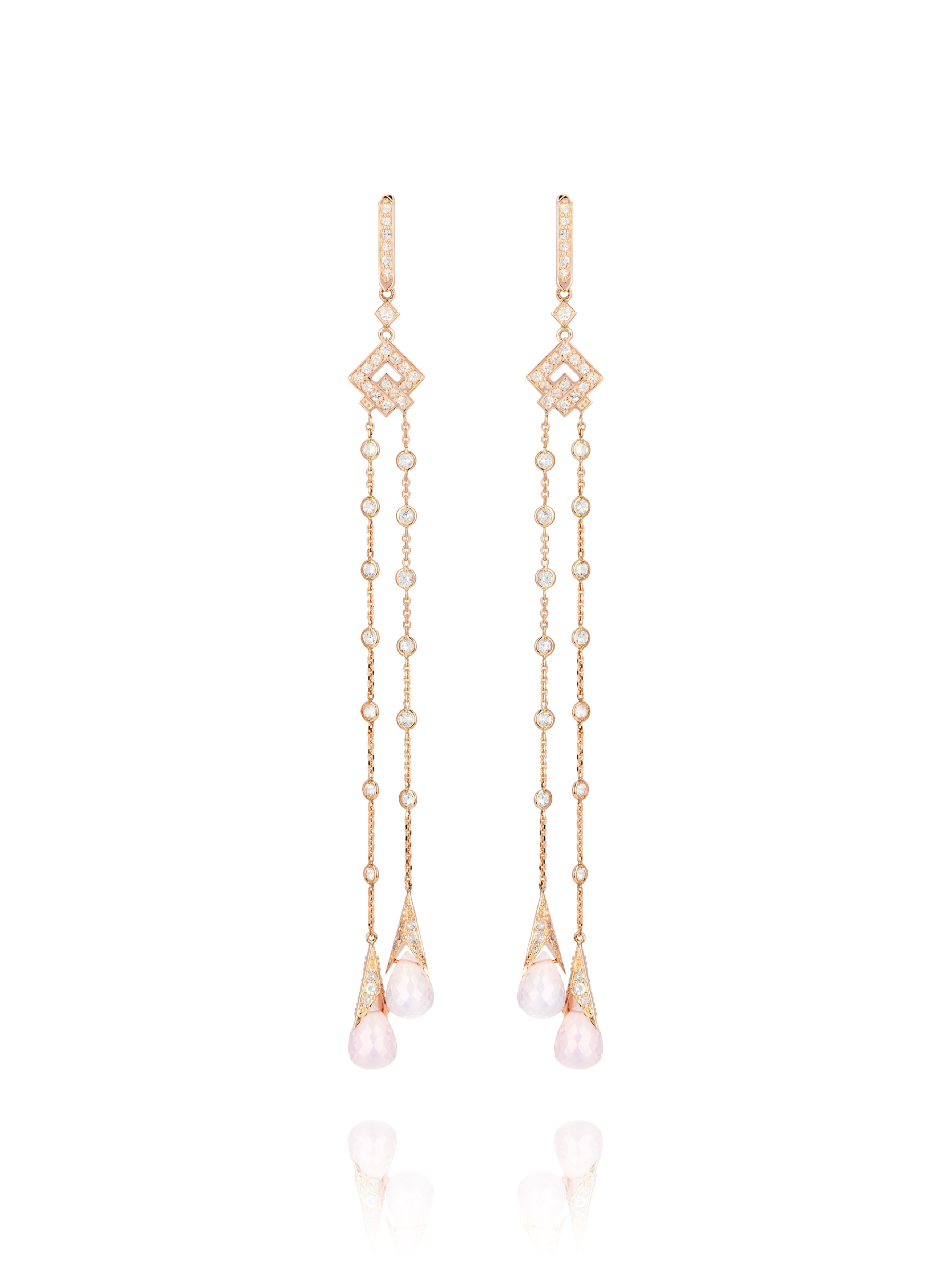 Earrings made of rose gold, inlaid with 124 colorless topazes with a total weight of 3.00 ct and 4 briolette-cut rose quartzes with a total weight of 11.60 ct.