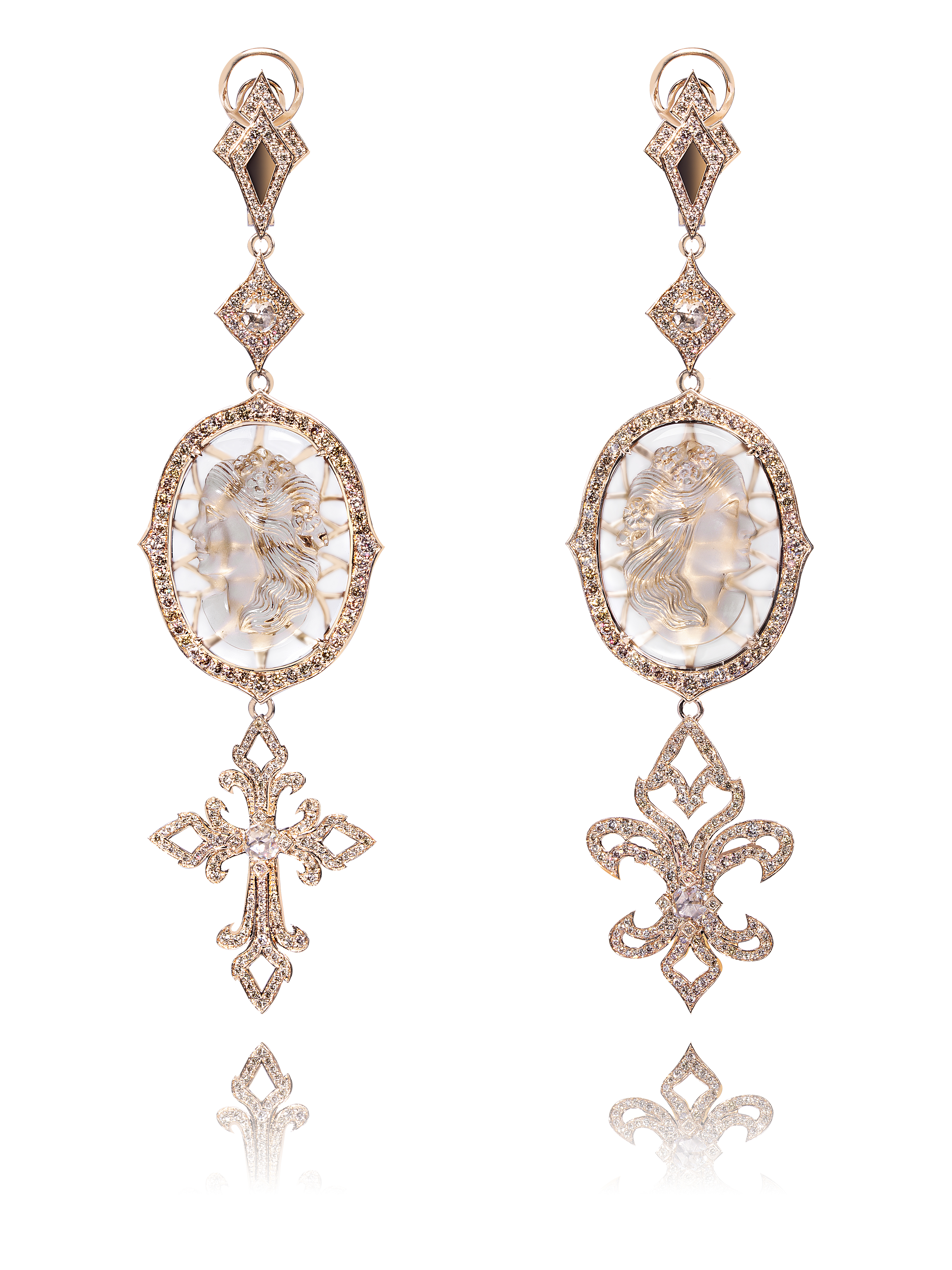 Earrings in rose gold, set with 481 brown diamonds with a total weight of 3.35 ct, 4 rose-cut diamonds with a total weight of 0.65 ct, and 2 cameos on smoky quartz with a total weight of 6.39 ct.