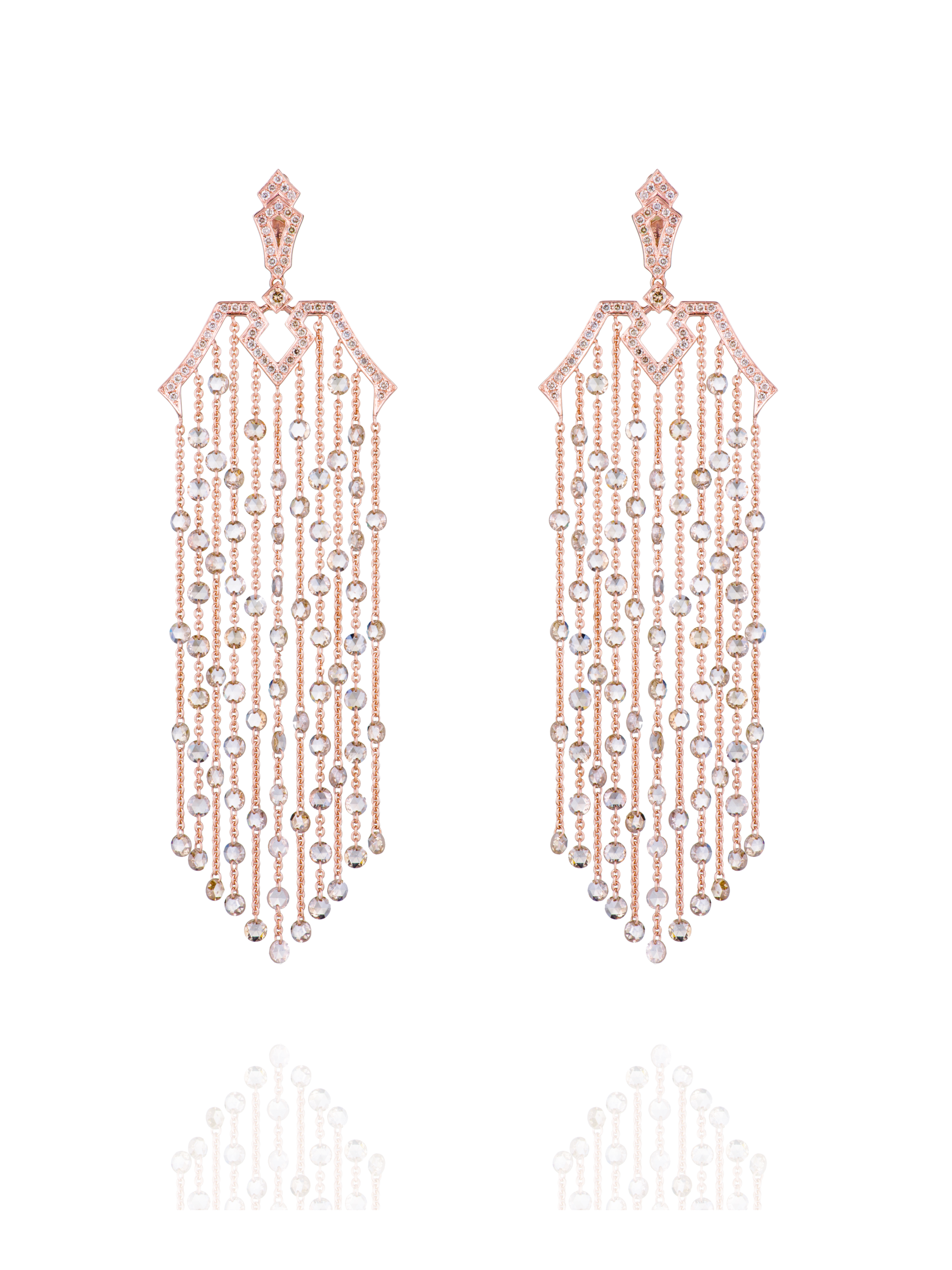 Earrings made of rose gold with 156 rose-cut brown diamonds with a total weight of 13.61 ct and 136 round-cut brown diamonds with a total weight of 1.15 ct. Length of the piece: 11 cm.