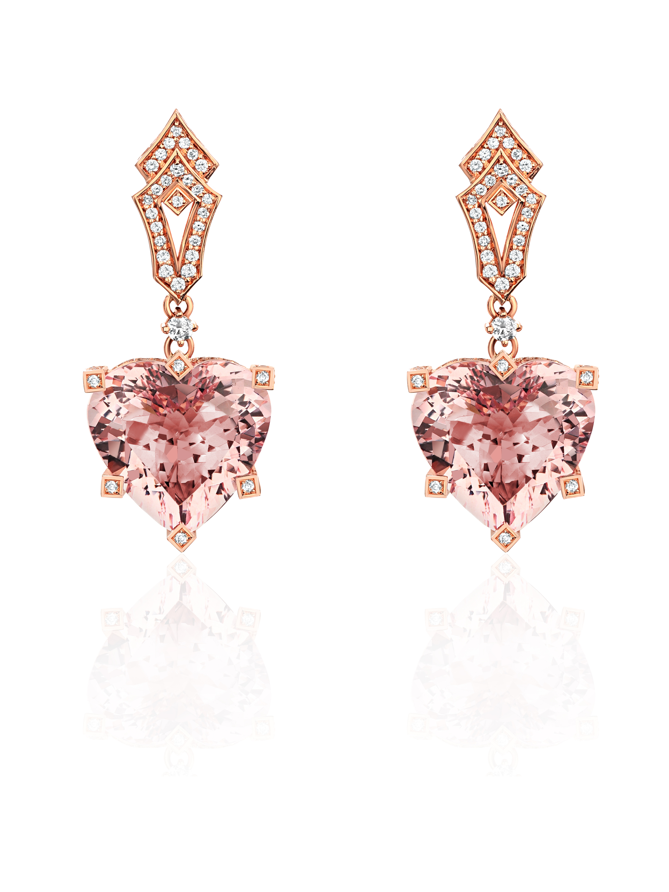 Earrings made of rose gold, encrusted with 2 heart-cut morganites with a total weight of 12.63 ct and 174 round-cut diamonds with a total weight of 0.59 ct. Length of the piece: 3.5 cm.