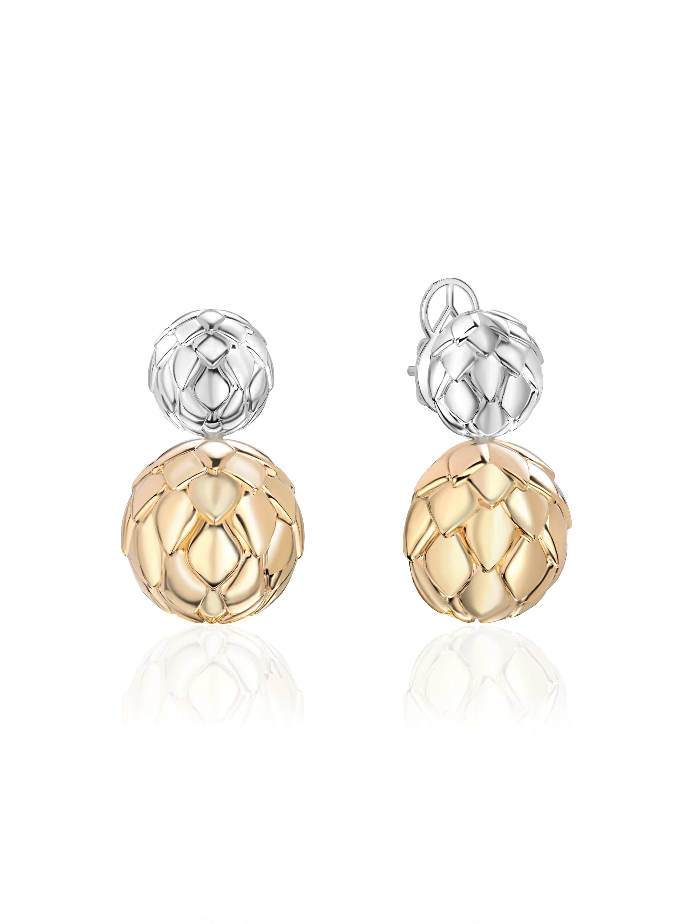 Yellow and white gold earrings with scales. Item length: 3 cm.