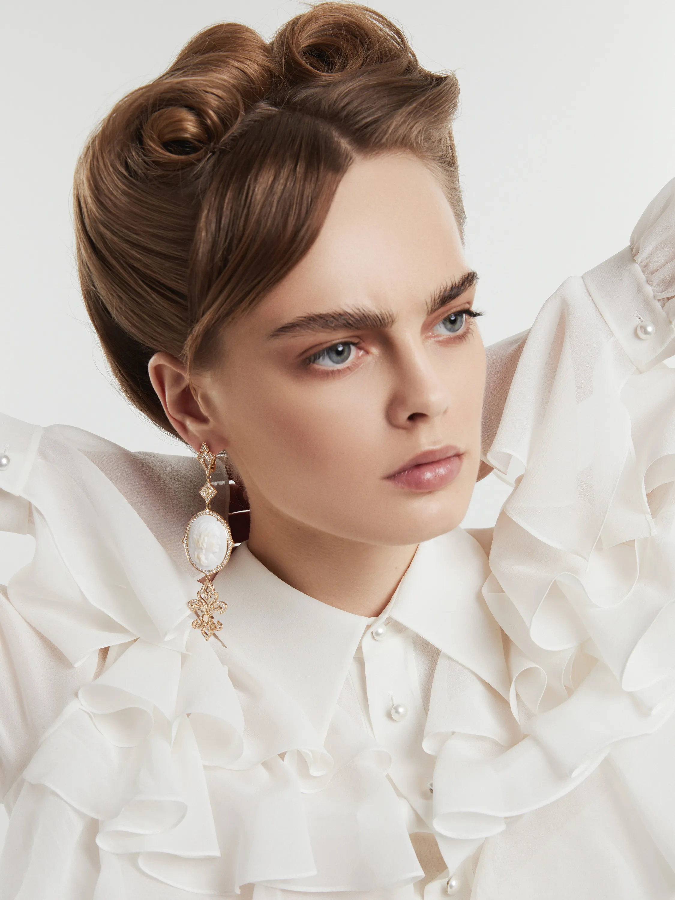 Yellow gold earrings with 2 cameos on shell with a total weight of 10.12 g, 481 round-cut diamonds with a total weight of 2.68 ct and 4 rose-cut diamonds with a total weight of 0.75 ct.