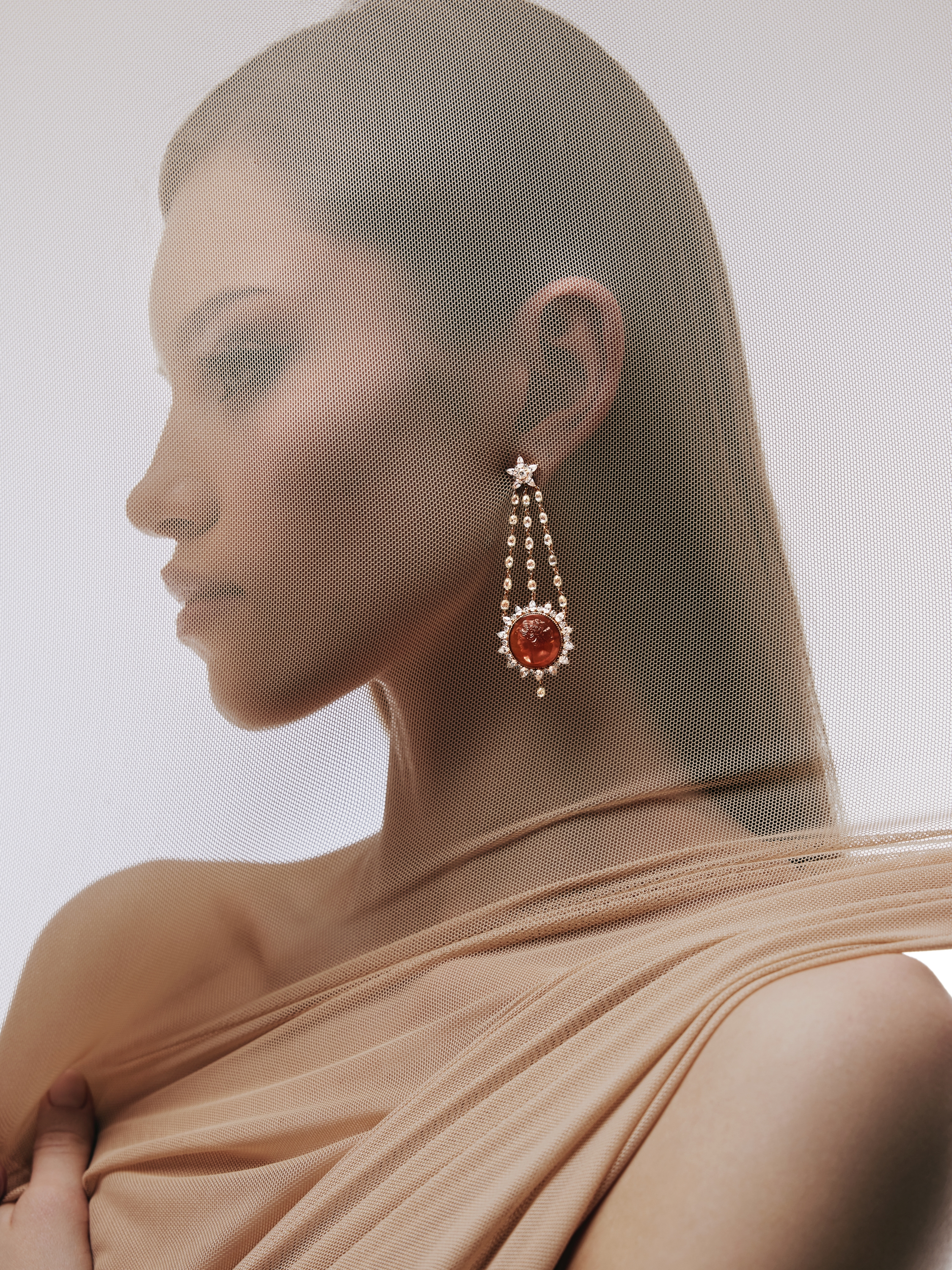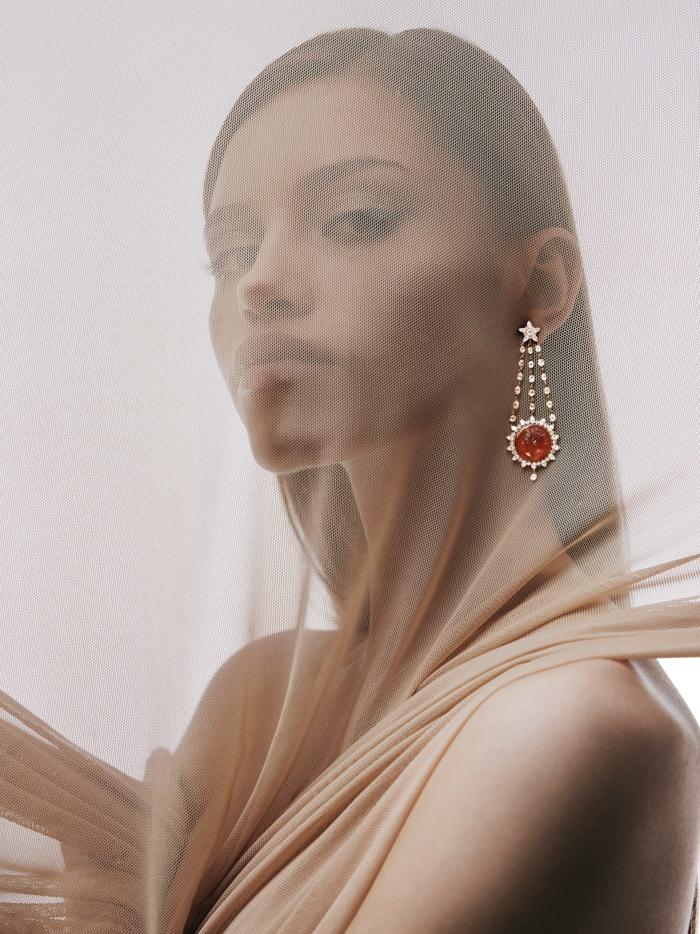 Yellow gold earrings with 2 cameos on carnelian with a total weight of 3.49 g, 38 pear-cut yellow diamonds with a total weight of 2.60 ct, 40 yellow round diamonds with a total weight of 0.98 ct and 36 briolette-cut yellow diamonds with a total weight of 5.40 ct. Item length: 6 cm.