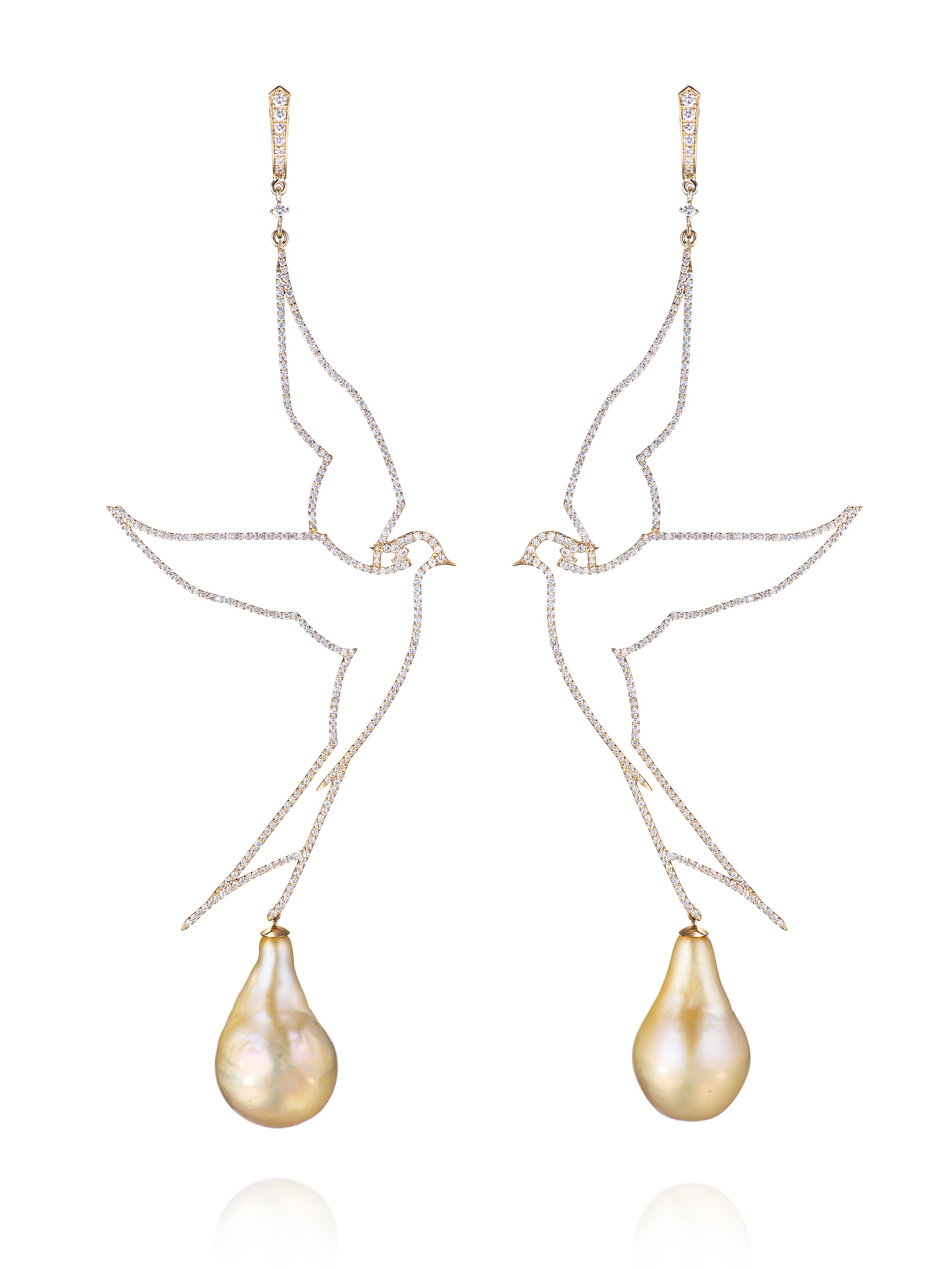 Earrings made of 18K yellow gold in the shape of birds, set with 564 round-cut diamonds with a total weight of 1.81 ct and 2 golden-colored pearls with a total weight of 10.90 g.