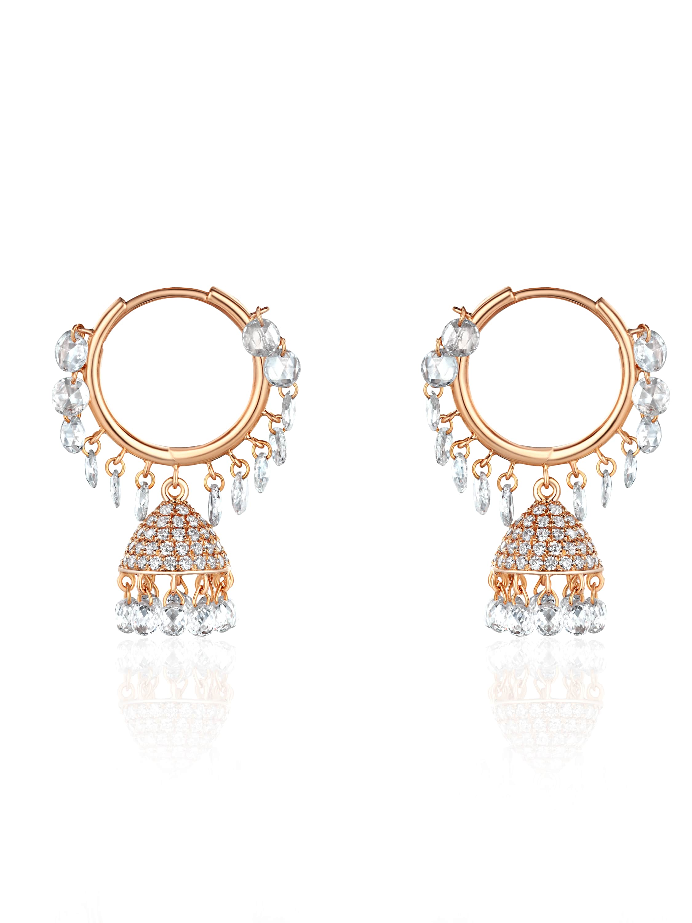 18K rose gold hoop earrings with pendants, set with 20 H/SI briolette-cut diamonds with a total weight of 1.98 ct, 26 H/SI Rose Cut diamonds with a total weight of 1.51 ct, 142 H/SI round-cut diamonds with a total weight of 0.68 ct.