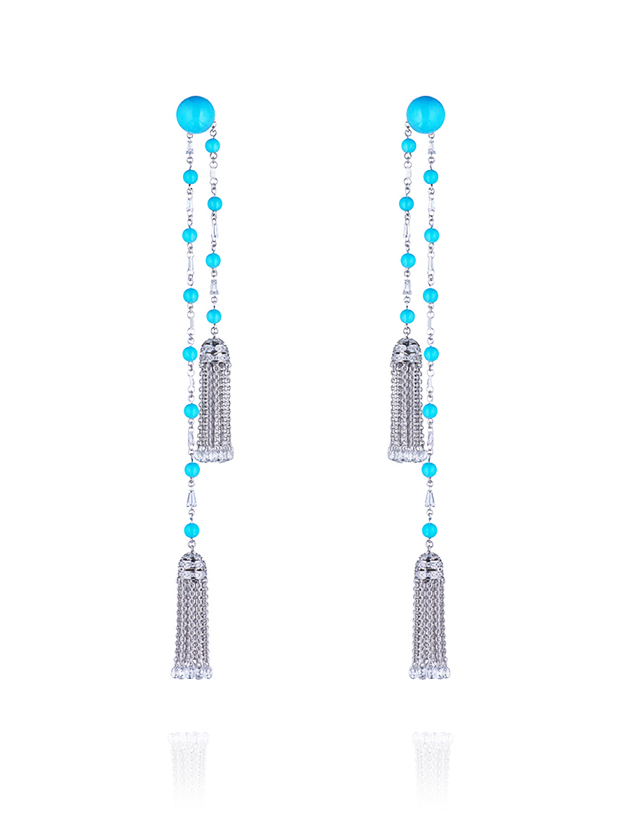 White Gold, Turquoise & Diamonds Double Tassel Earrings