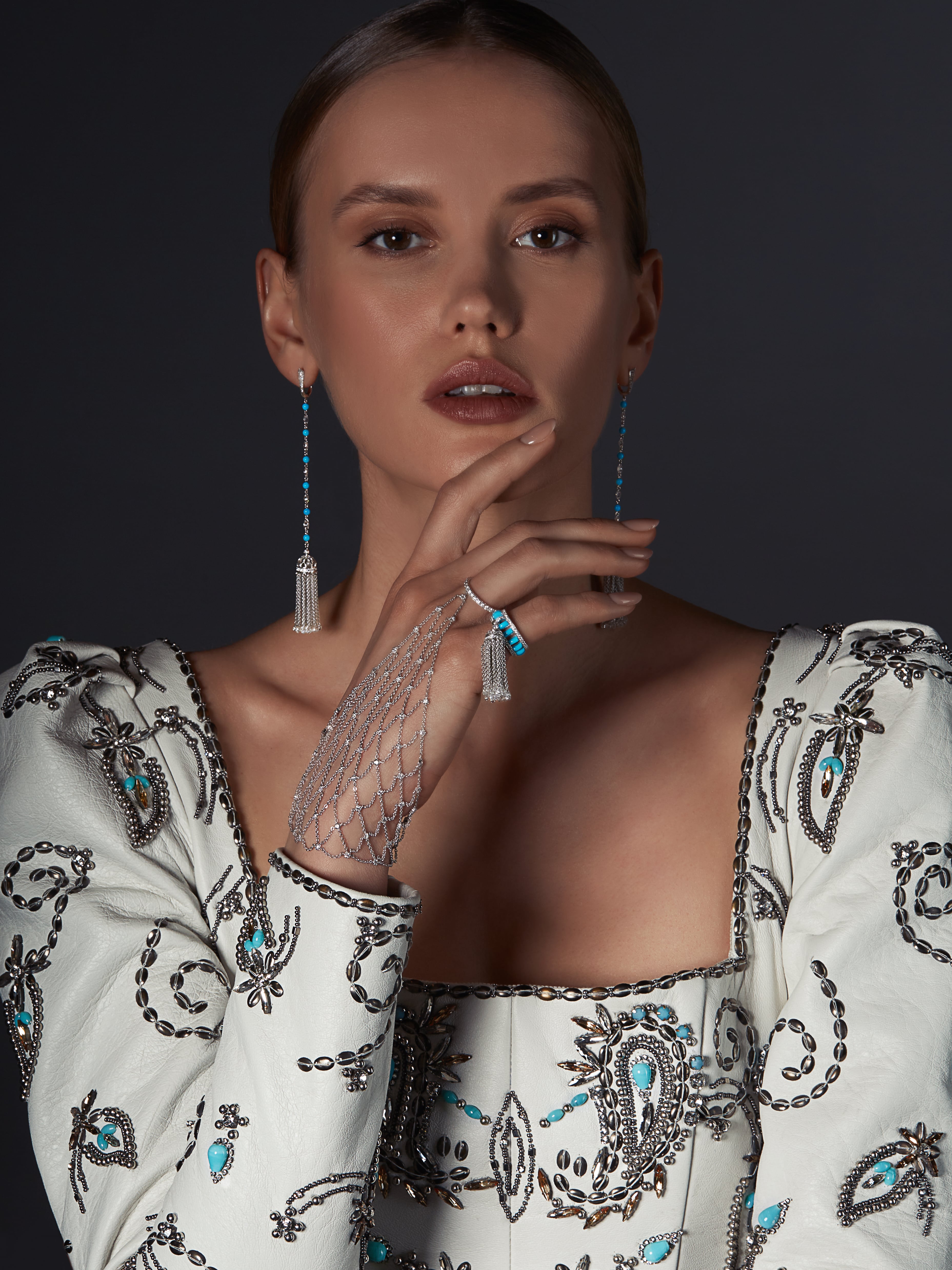 Tassel earrings in white gold with 8 turquoise beads with a total weight of 0.28 g, 10 round-cut diamonds with a total weight of 0.31 ct, and 50 briolette-cut diamonds with a total weight of 4.82 ct. Item length: 12 cm.